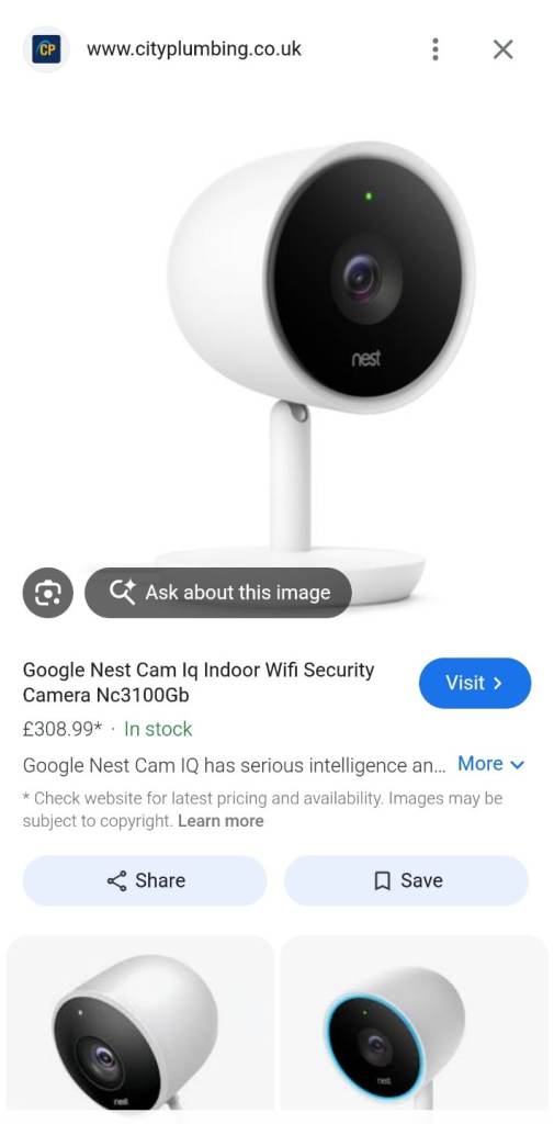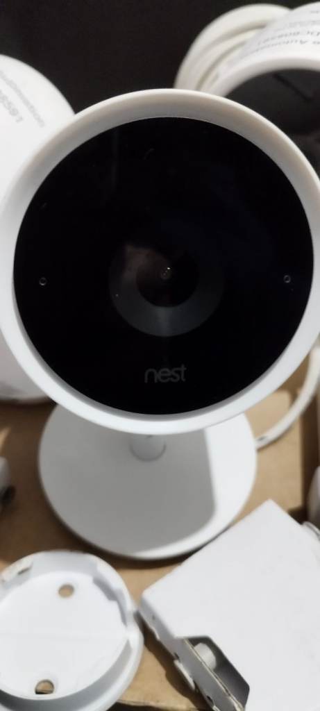 a Google Nest Cam IQ Indoor Security Camera, a smart home security device designed for indoor monitoring.