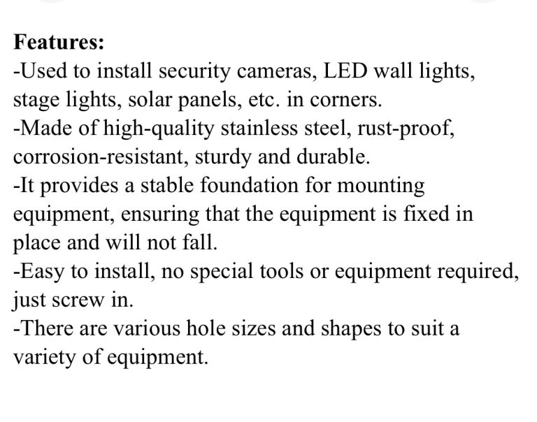 Made from stainless steel, this bracket is suitable for a variety of cameras and can be easily installed on corners to provide a secure mounting point.