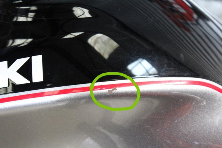 BAD POINTS/DAMAGE: This bike is dirty in places and would benefit from a good clean. This a stone chip on the tank (circled in green) and some scratches on the exhaust trim but other than that I cannot find any other damage on this bike. Please study the pics as this description is just a guide.
