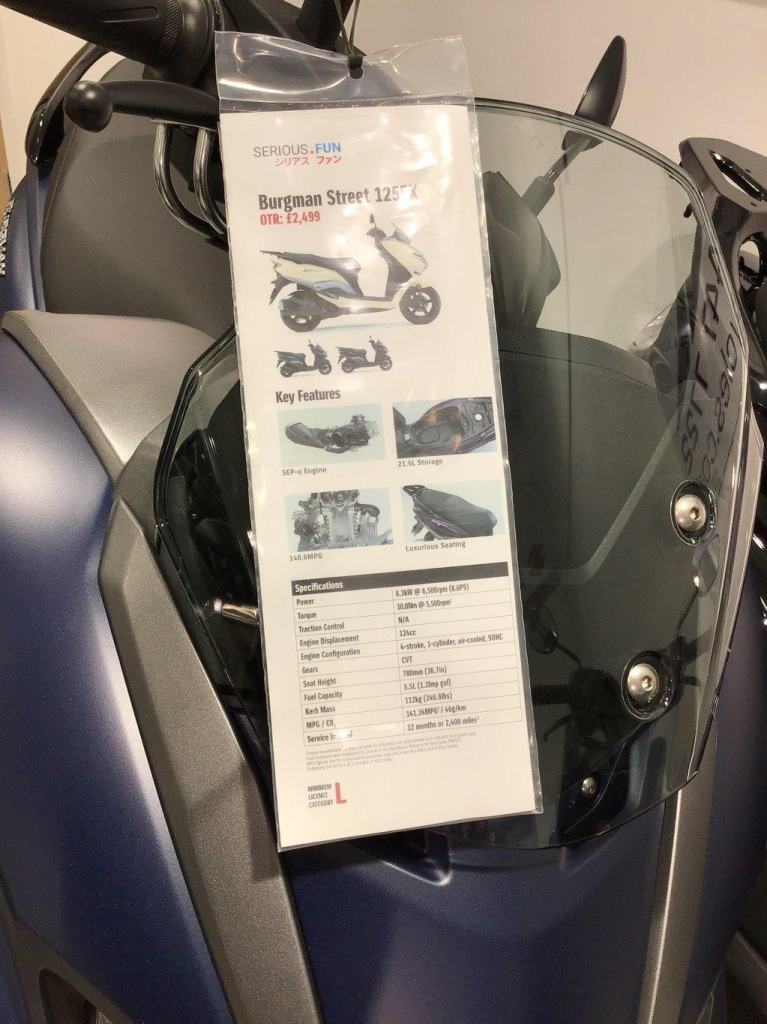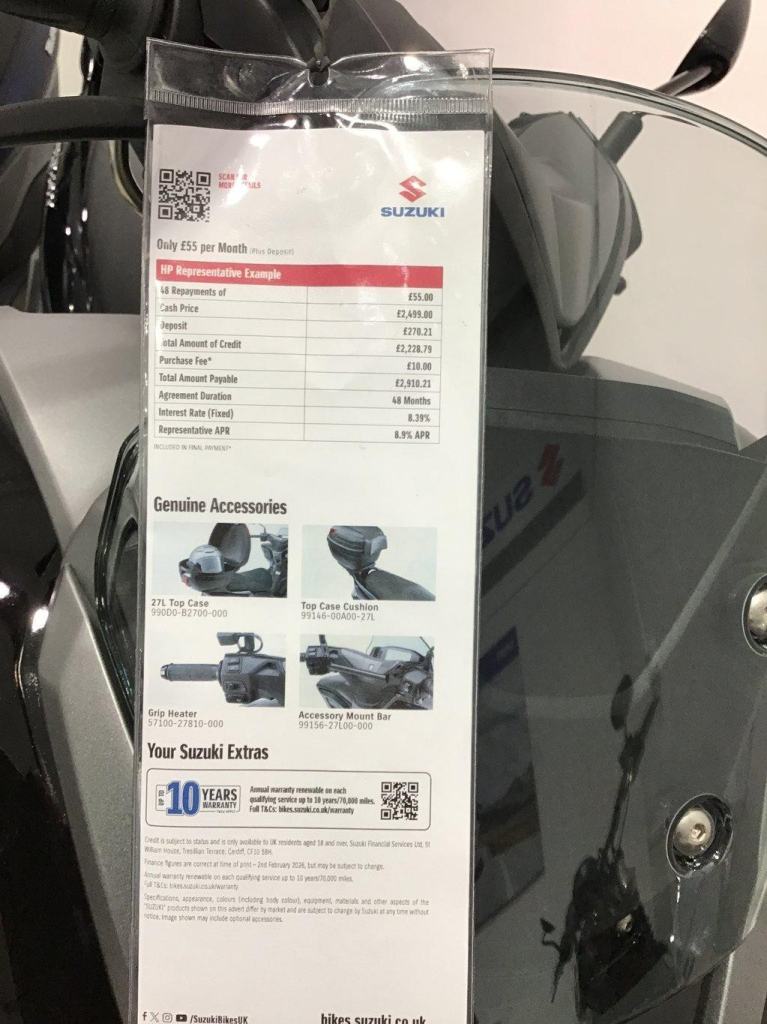 The 2026 Burgman Street 125 is here and available in all colours.Bigger and better more room to carry you stuff and perfect for the commuter or pleasure rider with great performance and super MPG plus a 10 year service activated warranty for peace of mind ownership.
