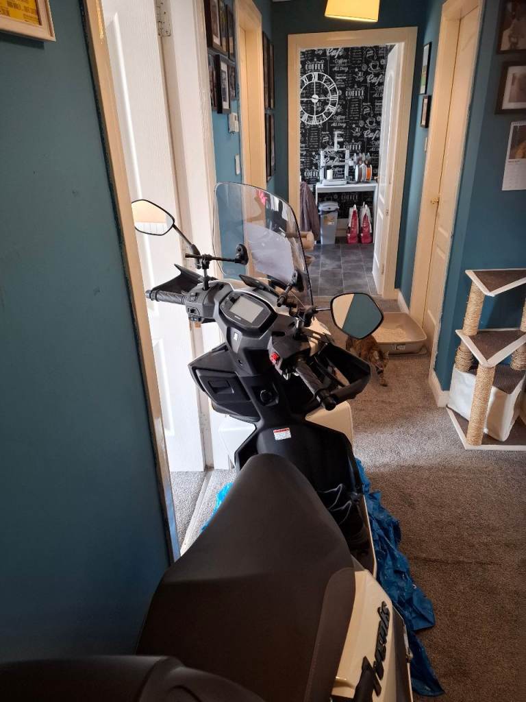 Only 823 miles on the clock. First service done. Comes with topbox and front screen.
