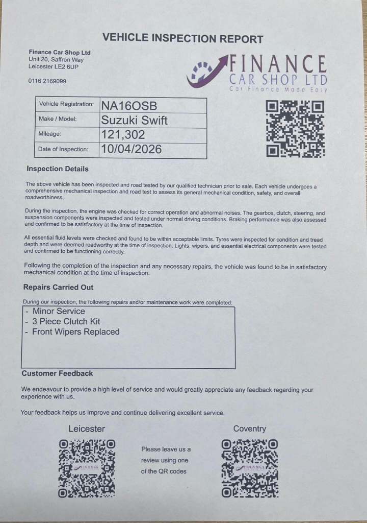 Suzuki Swift 1.2 Dualjet SZ4 Euro 6 (s/s) 5dr – ULEZ Friendly, Reliable & Great Spec A fantastic example of the highly sought-after Suzuki Swift 1.2 Dualjet SZ4, offering low running costs, sharp styling, and excellent reliability. Built by Suzuki, this compact hatchback is perfect for city driving, commuting, or first-time drivers.Key Features:1.2 Dualjet petrol engine – smooth, efficient & reliableSZ4 specification with great equipmentEuro 6 (s/s) – ULEZ compliant 5-door hatchback – practical and easy to driveLow insurance group & excellent fuel economyOutstanding Service History:Full service history12 stamps in the service book – well maintainedRecently serviced – ready to drive away with confidence1 owner from new – carefully looked afterTechnology & Equipment:Built-in Satellite Navigation (Sat Nav) Bluetooth connectivityAir conditioning Multifunction steering wheelElectric windows & mirrorsAlloy wheelsPractical & Comfortable:The Suzuki Swift offers a surprisingly spacious cabin, comfortable seating, and a practical boot—ideal for everyday use and longer journeys alike.+ 6 MONTHS WARRANTY INCLUDED + 6 MONTHS BREAKDOWN COVER + EXTENDED WARRANTY AVAILABLE + FINANCE OPTIONS AVAILABLE UPON REQUEST + DELIVERY CAN ONLY BE ARRANGED ONCE THE VEHICLE HAS BEEN VIEWED & INSPECTED IN PERSON AT OUR PREMISES + PHOTO ID IS REQUIRED FOR ALL VIEWINGS AND TEST DRIVES + WE CAN BE REACHED VIA WHATSAPP ON [Phone number removed] – FEEL FREE TO MESSAGE US + PLEASE NOTE, THE PRICE IS FIXED ON THIS VEHICLE. KINDLY BE AWARE OF THIS PRIOR TO ARRANGING A VIEWING + WE HAVE OVER 50 VEHICLES IN STOCK. AS NOT ALL VEHICLES ARE HELD ON SITE, PLEASE ENSURE YOU CALL IN ADVANCE BEFORE MAKING YOUR JOURNEY + BANK TRANSFER ONLY + MORE CARS AVAILABLE AT:WWW.FINANCECARSHOPLTD.CO.UK +