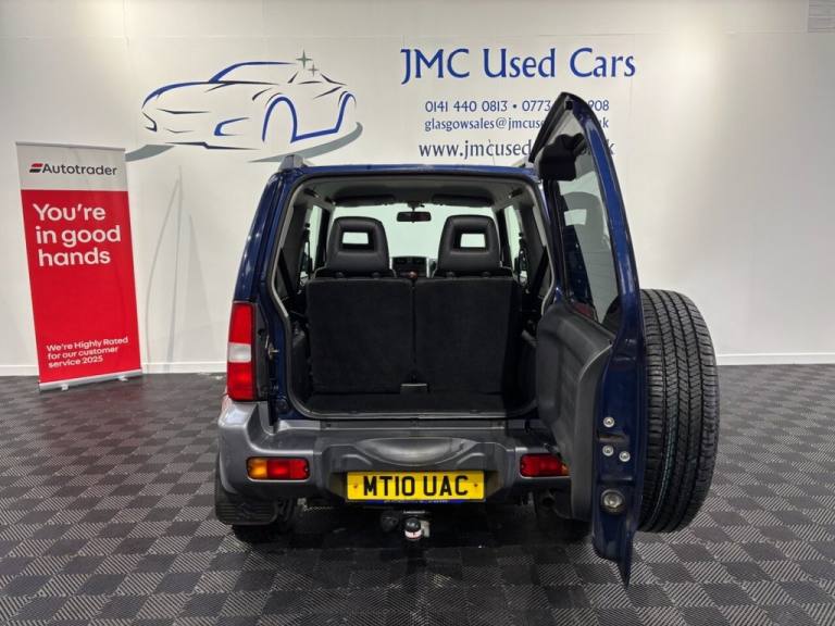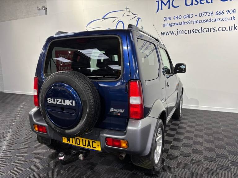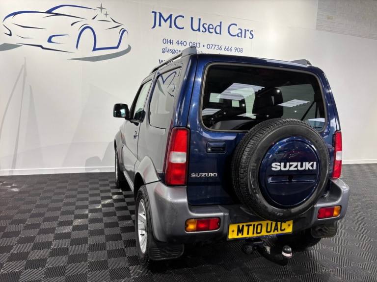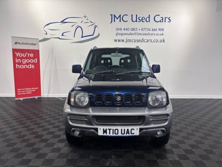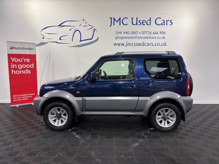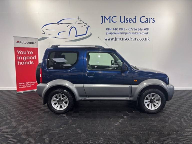 The Suzuki Jimny 1.3 SZ4 SUV 3dr Petrol Manual is a characterful, rugged little 4×4 thats surprisingly capable off-road thanks to its lightweight design, strong 4WD system and good ground clearance — perfect for tackling rough tracks or slippery conditions where many soft-road SUVs struggle. On-road its more old-school and basic, with a modest 1.3 litre engine, firm ride and simple interior, but its compact size makes it easy to park, and its built tough with a loyal following among fans of genuine off-road fun. Overall, its a unique, dependable and fun little SUV if you value real 4×4 ability and personality over refinement. Award-Winning Family Business Premium Customer Service & Aftercare Located just off Junction 24 of the M8 in Glasgow, we offer an impressive range of quality used cars, all displayed in our indoor showroom. Each vehicle is meticulously prepared to meet our high standards, ensuring youre driving away with complete confidence. We welcome part exchanges and offer tailored finance and warranty packages to suit every budget. Need help choosing the right car? Our team is here to provide expert advice and support. Cant make it in person? No problem! We offer live video walkarounds of our cars upon request, and you can complete all finance agreements securely online. For more details or to arrange a viewing, contact Martin today. JMC USED CARS WWW.JMCUSEDCARS.CO.UK [Email address removed. Click Email button to contact us.] MILEAGE, 4X4, 1 YEAR MOT, LOADS OF SERVICE HISTORY, AA WARRANTY AVAILABLE, Nocturne Blue Pearl Metallic, Part Leather, Adjustable Steering Column/Wheel, Air Bag Driver, Air Bag Passenger, Air-Conditioning, Alloy Wheels (15in), Anti-Lock Brakes, Armrest, Ashtray/Lighter, Body Coloured Bumpers, Central Door Locking, Clock, Cup Holder, Electric Windows (Front), Front Fog Lights, Head Restraints, Heated Rear Screen, Immobiliser, In Car Entertainment (Radio/CD), Metallic Paint, Mirrors External, Power-Assisted Steering, Rev Counter, Roof Rails, Side Protection Mouldings, Speakers, Steering Wheel Leather, Sun Visor, Third Brake Light, Tinted Glass (Rear Windows), Towing Equipment (Preparation), Trip Computer, Upholstery Cloth, Upholstery Cloth/Leather, Upholstery Leather
