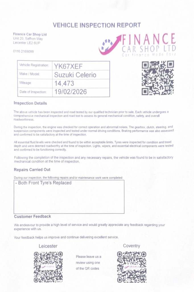 Economical & Reliable City Car – Full Service History – 1 Former KeeperDiscover this Suzuki Celerio 1.0 SZ2 Euro 6, a practical and efficient small hatchback perfect for city driving, commuting, or first-time drivers. With a full Suzuki service history and a single former keeper, this Celerio has been meticulously maintained and is ready to drive away.Key DetailsFull Suzuki Service History – well maintained1 Former KeeperEuro 6 – ULEZ compliant1.0 Petrol Engine – economical & reliableFeaturesSZ2 Specification – practical and well equippedAir Conditioning – comfort in all seasonsBluetooth Connectivity – hands-free calls & audioElectric WindowsRemote Central LockingSteering Wheel ControlsCompact Size – ideal for city driving & easy parkingWith its full service history, low running costs, and easy-to-drive design, this Suzuki Celerio is a fantastic choice for anyone looking for a dependable, economical, and well-maintained city car.+ 6 MONTHS WARRANTY INCLUDED + 6 MONTHS BREAKDOWN COVER + EXTENDED WARRANTY AVAILABLE + FINANCE OPTIONS AVAILABLE UPON REQUEST + DELIVERY CAN ONLY BE ARRANGED ONCE THE VEHICLE HAS BEEN VIEWED & INSPECTED IN PERSON AT OUR PREMISES + PHOTO ID IS REQUIRED FOR ALL VIEWINGS AND TEST DRIVES + WE CAN BE REACHED VIA WHATSAPP ON [Phone number removed] – FEEL FREE TO MESSAGE US + PLEASE NOTE, THE PRICE IS FIXED ON THIS VEHICLE. KINDLY BE AWARE OF THIS PRIOR TO ARRANGING A VIEWING + WE HAVE OVER 50 VEHICLES IN STOCK. AS NOT ALL VEHICLES ARE HELD ON SITE, PLEASE ENSURE YOU CALL IN ADVANCE BEFORE MAKING YOUR JOURNEY + BANK TRANSFER ONLY + MORE CARS AVAILABLE AT:WWW.FINANCECARSHOPLTD.CO.UK +