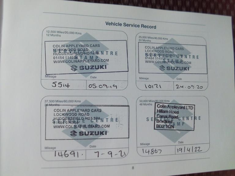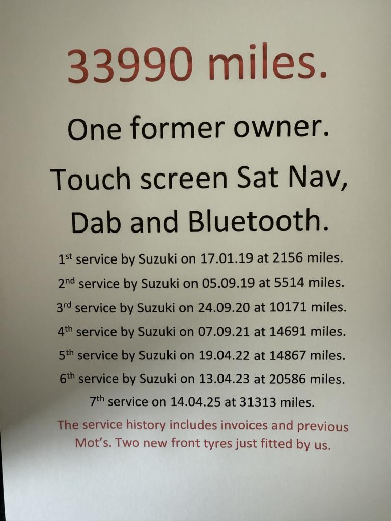 2018 (68) Suzuki Vitara 1.6 SZ-T. Just one former owner and comes with 2 keys, full service history X7 and only 33990 miles from new. You can either have this car on it's current cherished plate S23 RVY or we will put it back on it's original age related plate of YH68 EXM free of charge. A great car that comes with Bluetooth, Dab and Sat Nav. 2 new front tyres just fitted by us. Serviced as follows, 1st service by Suzuki on 17.01.19 at 2156 miles. 2nd service by Suzuki on 05.09.19 at 5514 miles. 3rd service by Suzuki on 24.09.20 at 10171 miles. 4th service by Suzuki on 07.09.21 at 14691 miles. 5th service by Suzuki on 19.04.22 at 14867 miles. 6th service by Suzuki on 13.04.23 at 20586 miles. 7th service on 14.04.25 at 31313 miles. The service history includes invoices and previous Mot's. Full spec as follows, Remote central locking, Touch screen Sat Nav, Power steering, Front and rear electric windows, Electric and heated door mirrors, Dab radio with steering wheel controls, Bluetooth hands free phone integration with voice control, Alloy wheels, Front fog lights, Reverse camera, Air conditioning, Cruise control, Climate control, Front and rear carpet mats, Bluetooth music streaming, Adjustable intermittent wipers, Trip computer, Usb port, Rear privacy glass, Multi-function leather steering wheel, Stop/Start, Abs, Roof rails, Variable boot floor, Alarm, Led daytime running lights, Isofix child seat anchor points, Tpms, Hill start assist, Illuminating courtesy mirrors, Traction control, Rear headrests, Height adjustable front seats, Adjustable steering column, Multiple air bags. Cars for your family from a small family business established in 1977. Finance available plus debit cards are welcome. We do not charge admin fees. All our cars are Hpi clear and come with a full Mot, 35 point health check, plus a free warranty. To view around 30 similar vehicles please click on to our website. Please log onto our website. Thanks for looking