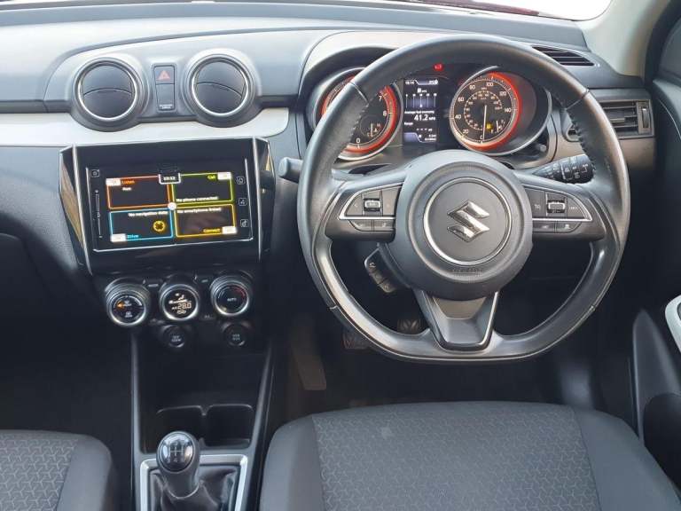.The specs show the SZ5 trim of this model returns up to 65.6 mpg combined and CO emissions as low as 98 g/km. The SZ5 is a top spec for the Swift model: youll benefit from full five-door practicality (so easy access for rear passengers), a 265 litre boot for everyday loads and stylish red paint that gives it premium kerb appeal. With only 51,824 miles, youre buying a car thats already had the first big depreciation hit yet still has plenty of life ahead. Its ideal whether youre commuting, running errands or heading off for weekend fun. The turbocharged engine ensures highway overtakes are brisk and the hybrid assistance means city crawling should be kinder on your wallet. In short: this Swift hits the sweet spot of fun drive + strong efficiency + real world usability, all wrapped in a stylish and practical 5-door package. If youre looking for a small car that doesnt feel compromised, this one deserves your attention. Would you like details on its service history or optional extras to complete the picture?.Adaptive cruise control, Automatic start/stop system, Bluetooth hands free telephone connection, Digital clock, Fuel consumption screen, Lane departure warning system, Lights on warning, Low fuel level warning light, Navigation system, Outside temperature display, PAS, Pearl white instrument panel and front door trim, Rear parking camera, Smartphone connectivity, Tachometer, Trip computer, 4 speakers + 2 tweeters, 4.2-Inch Colour LCD display, Auxiliary input socket, Bluetooth audio streaming, DAB Digital radio, Steering wheel audio controls, USB interface, 'Guide me home' headlamps, 2 speed wipers+intermittent wipe, Automatic headlights, Black coloured A & B pillars, Body colour door mirrors and handles, Body coloured bumpers, Electric folding door mirrors, Electric front windows + drivers one touch, Electric rear windows, Front fog lights, Headlamp levelling, Heated door mirrors, High beam assist, LED headlights with LED daytime running lights, LED rear lights, Rear privacy glass, Rear wiper, Tinted glass, 3 cupholders, 3 spoke leather covered steering wheel, 60/40 split rear seats, Accessory socket, Automatic air conditioning, Centre console storage, Chrome handbrake release button, Chrome inside door opener, Cloth seat trim, Door pockets with bottle holder, Driver/passenger sunvisors with ticket holders + vanity mirrors, Front head restraints, Front map light, Front passenger side assist grip, Glovebox, Height adjustable driver's seat, Isofix,