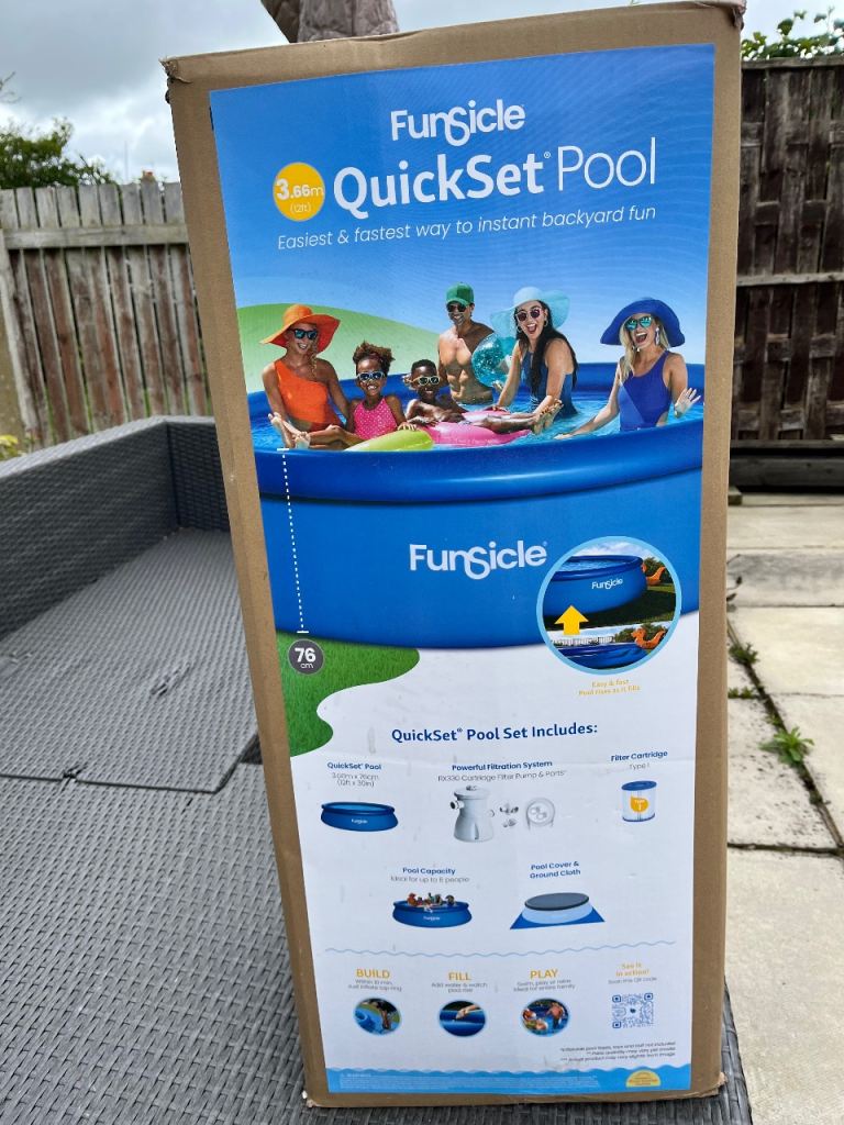 Wee boy is having a clear out. Kids swimming pool with parasol. Brand new never used.