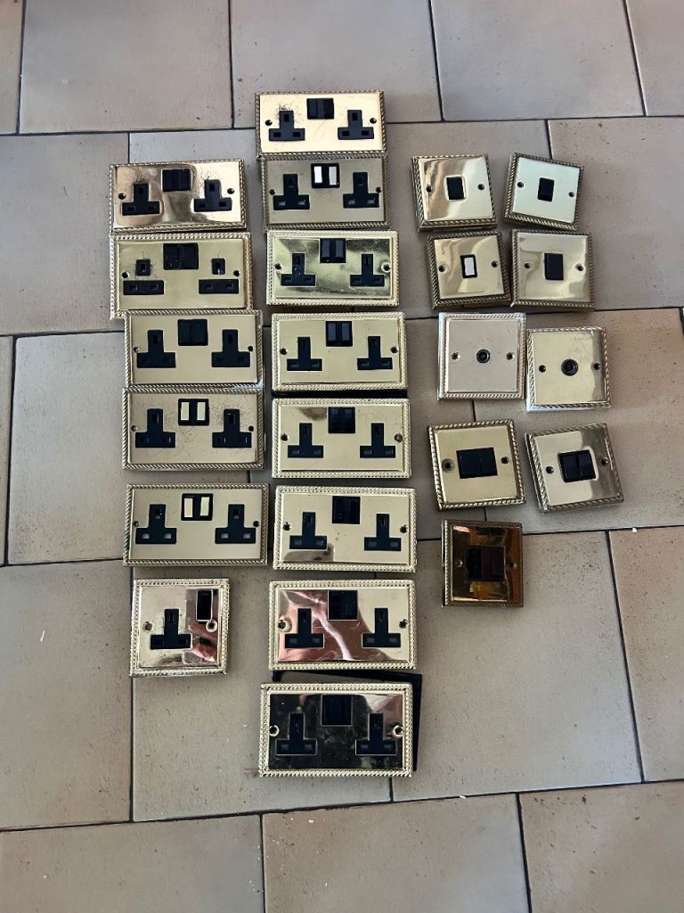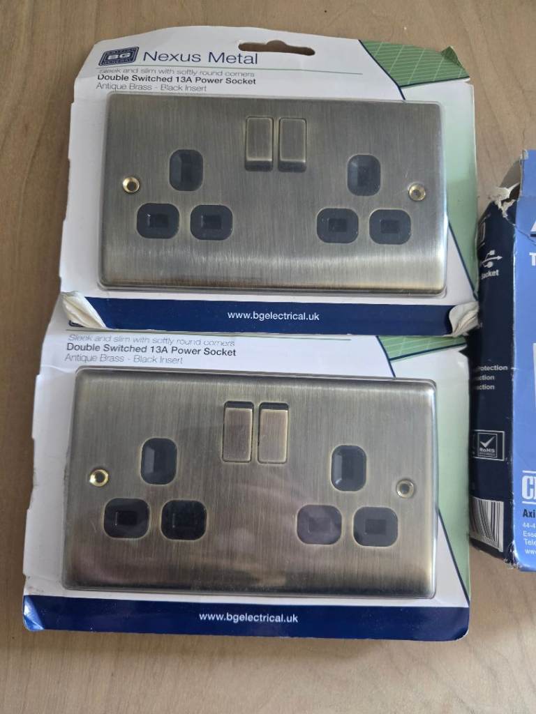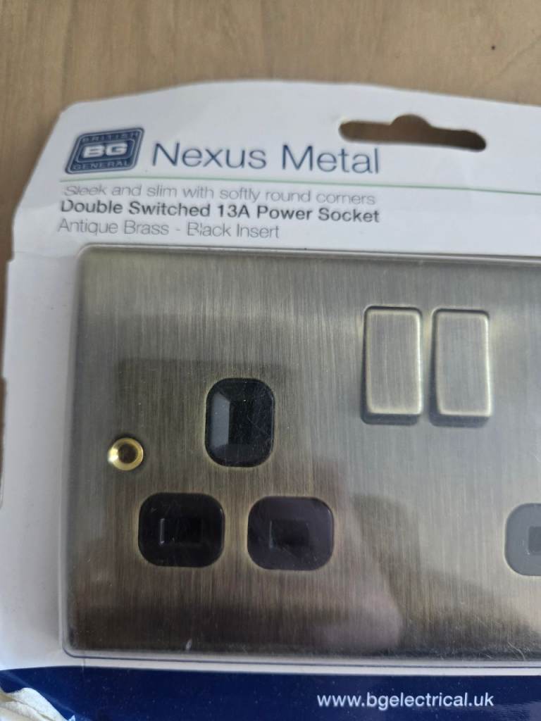 - 2x BG Nexus Metal Double Switched 13A Power Sockets: Premium "Antique Brass" finish with a sleek, slim profile, softly rounded corners, and black inserts for a modern vintage look.