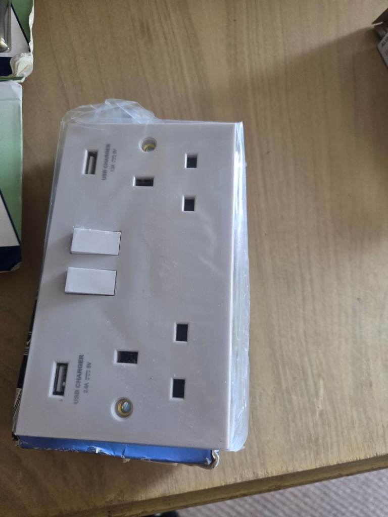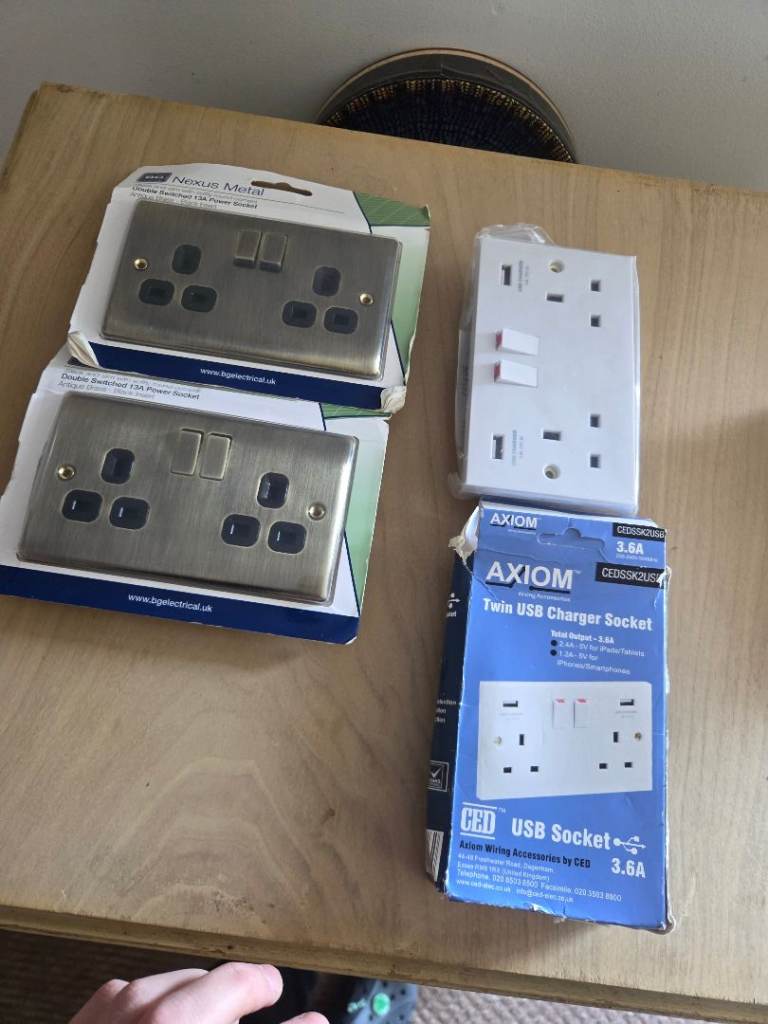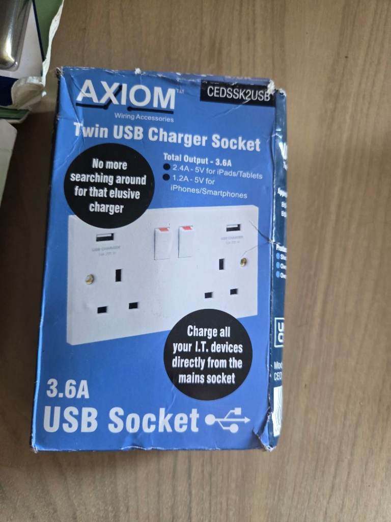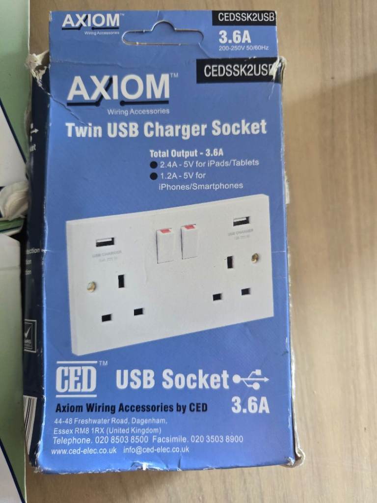 - 1x Axiom (CED) Twin USB Charger Socket: White double socket with two integrated USB ports (Total output 3.6A). Ideal for charging smartphones and tablets without using up plug space. Includes individual switches for the 13A sockets.
