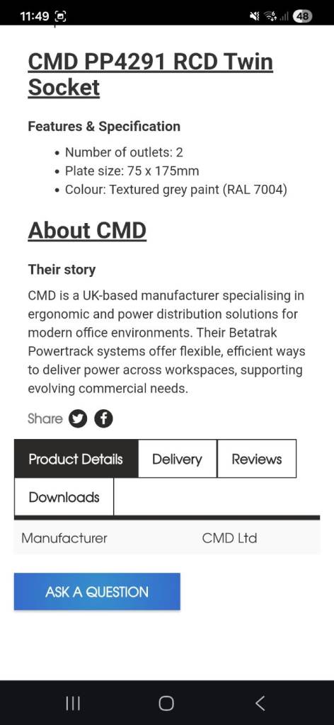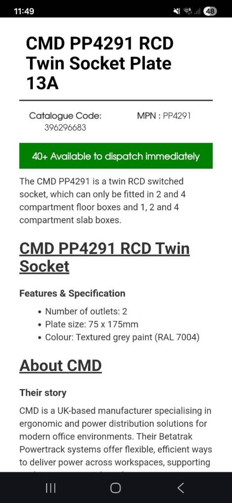 The CMD PP4291 is a twin RCD switched socket, which can only be fitted in 2 and 4 compartment floor boxes and 1, 2 and 4 compartment slab boxes.