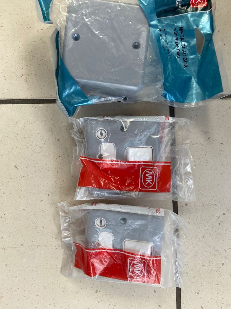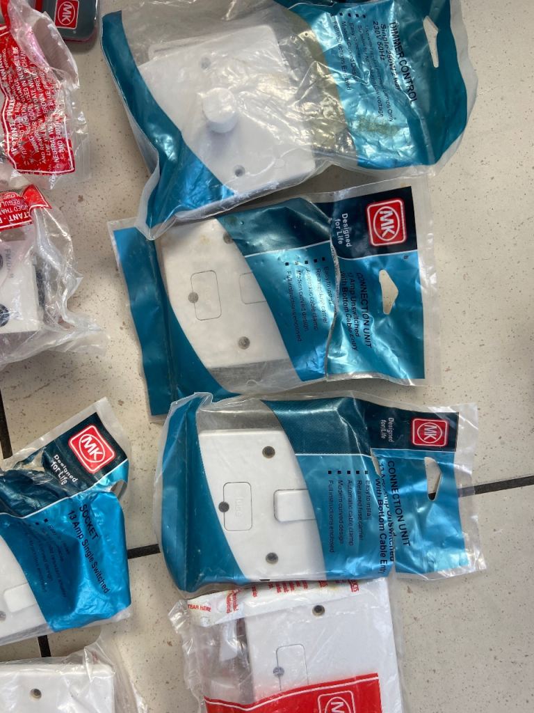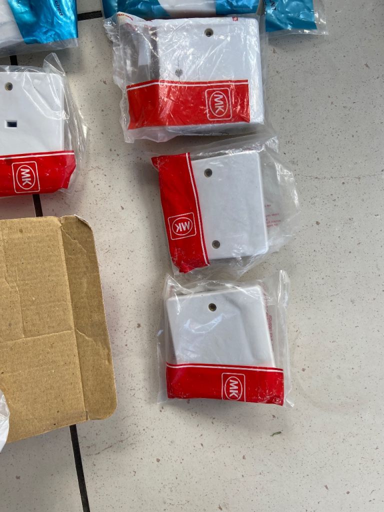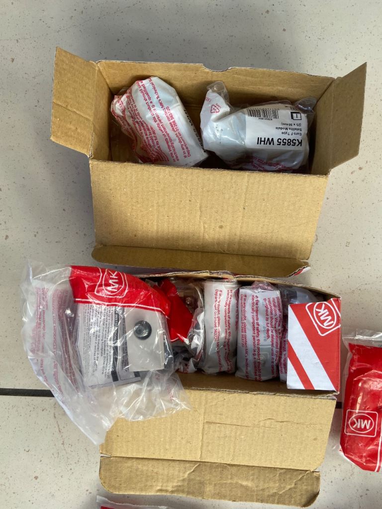 MK electrical fittings surplus to project. Some packages opened but items unused.