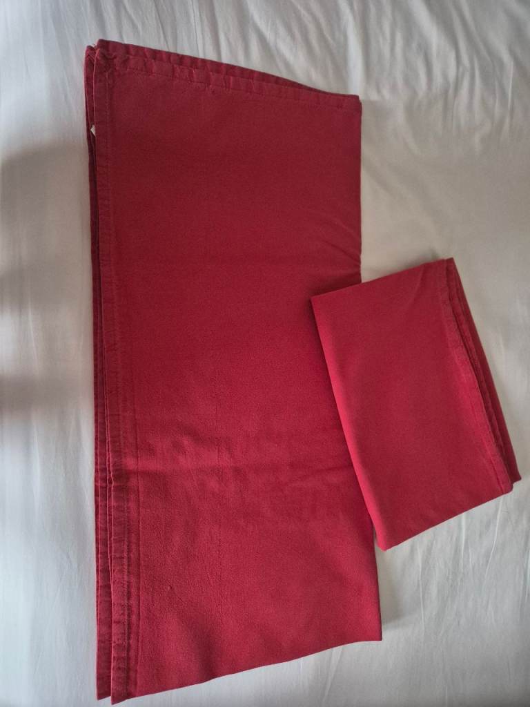 2 x 100% cotton tablecloths in red. They are heavy cotton and are square measuring approx 120cm x 120cm. Slightly used but still in excellent condition. If you don't want them as tablecloths you could use the fabric for making something else. Smoke free and pet free home. £3 each or both for £5.