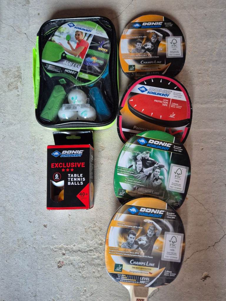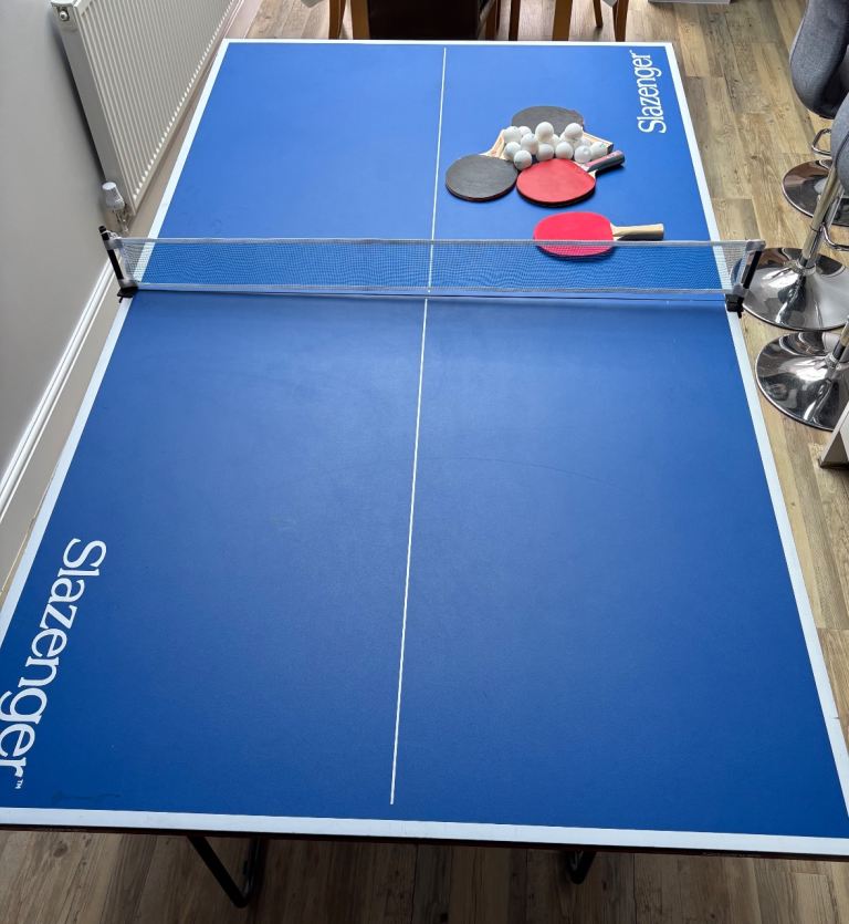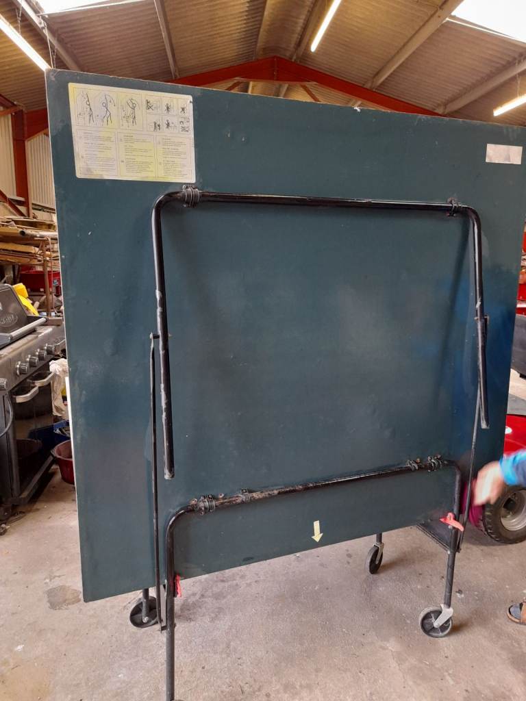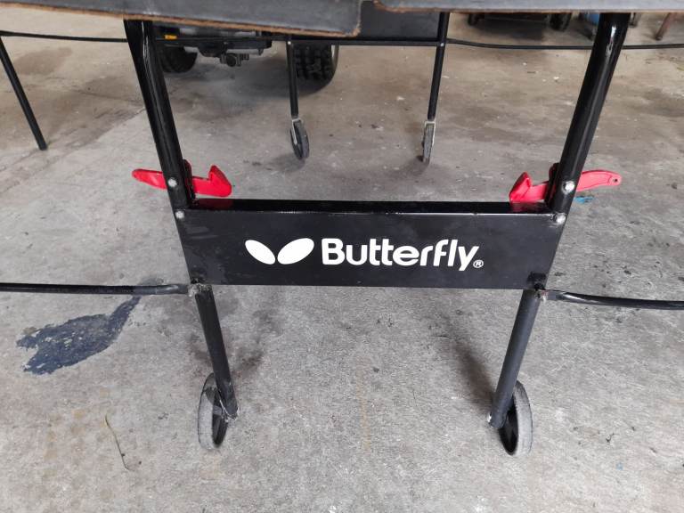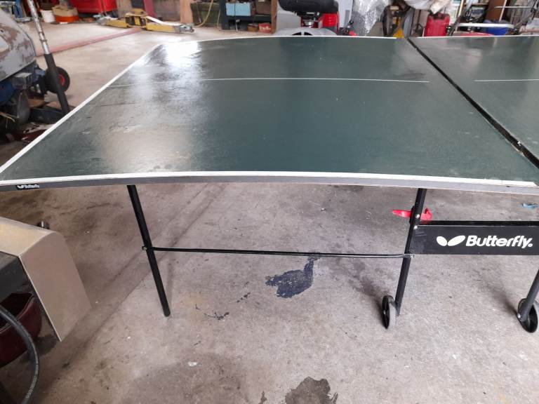 This is a full size table tennis table made by Butterfly, needs to go as children now long gone and it is no longer used. The folding frame and one side of the table are in excellent condition but the other side of the table is warped as can be clearly seen in the photos, a bit of ingenuity would straighten it out or a new sheet of plywood. Comes with net and an assortment of bats and balls. Open to sensible offers!