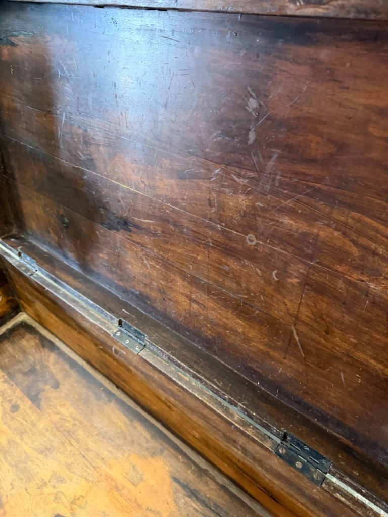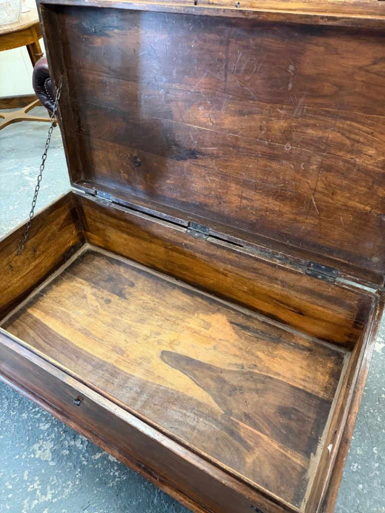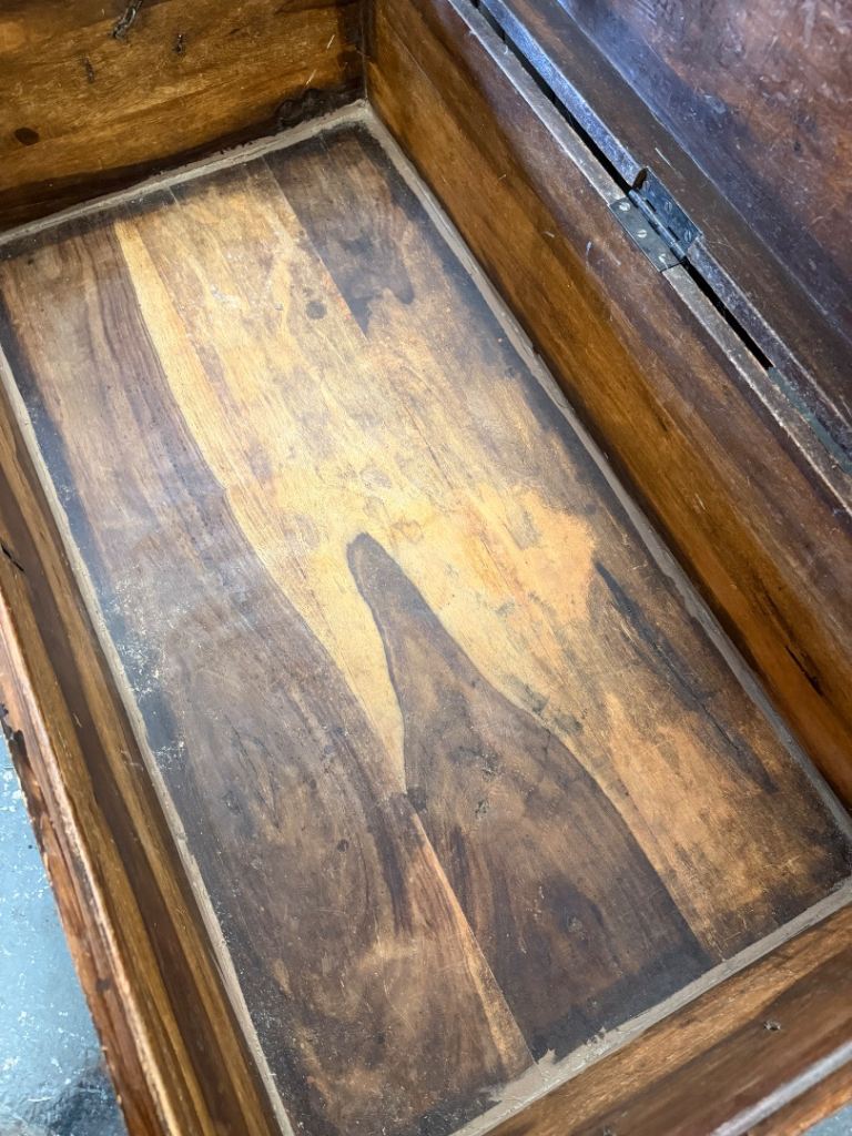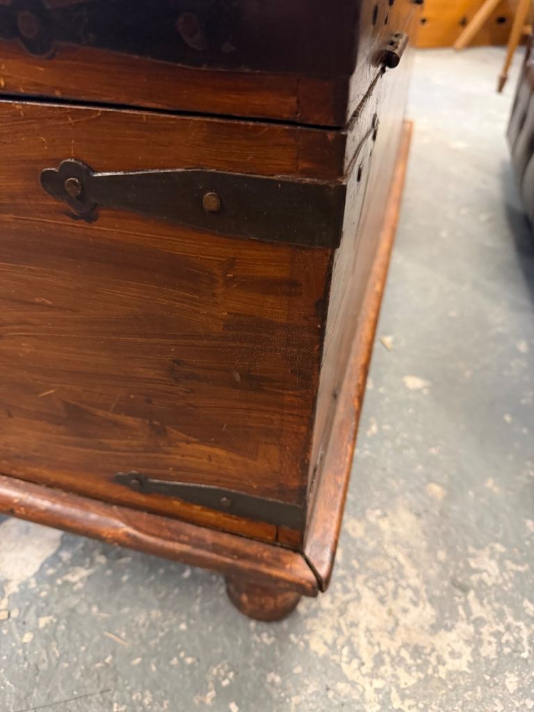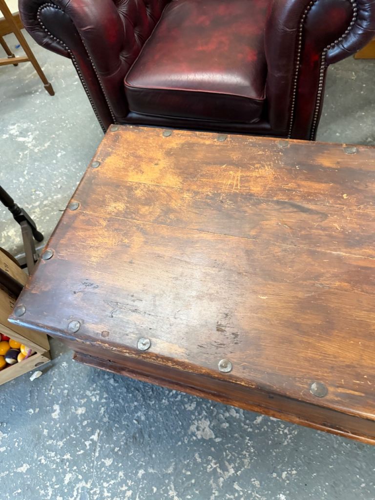 Fantastic character piece – a solid wooden trunk with beautiful aged patina and traditional iron strapwork. This is a really versatile item that works equally well as a coffee table, blanket box, or storage chest.