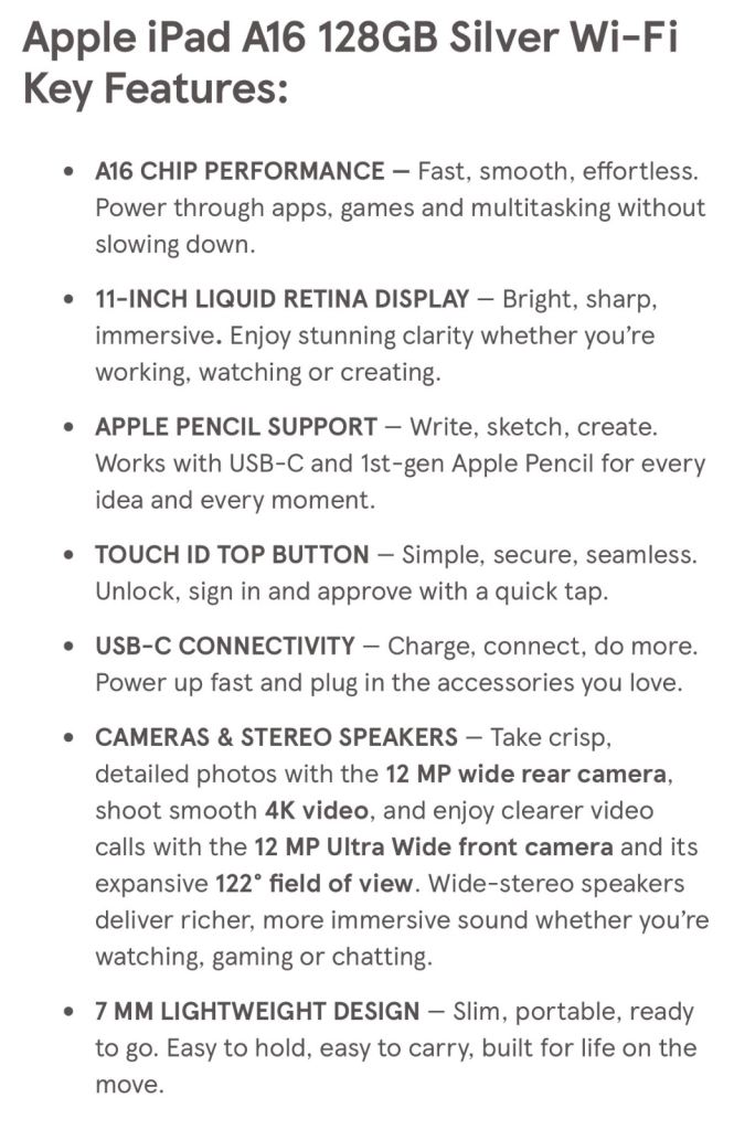 Apple iPad A16, 11-inch model with 128GB storage and Wi-Fi connectivity.