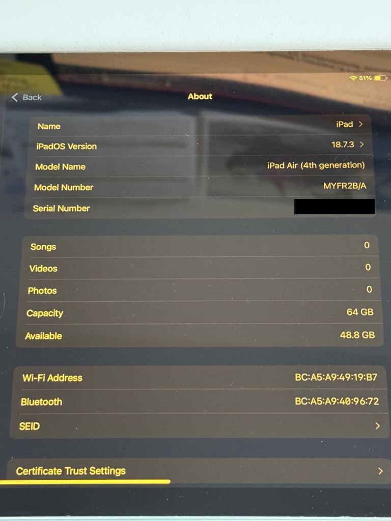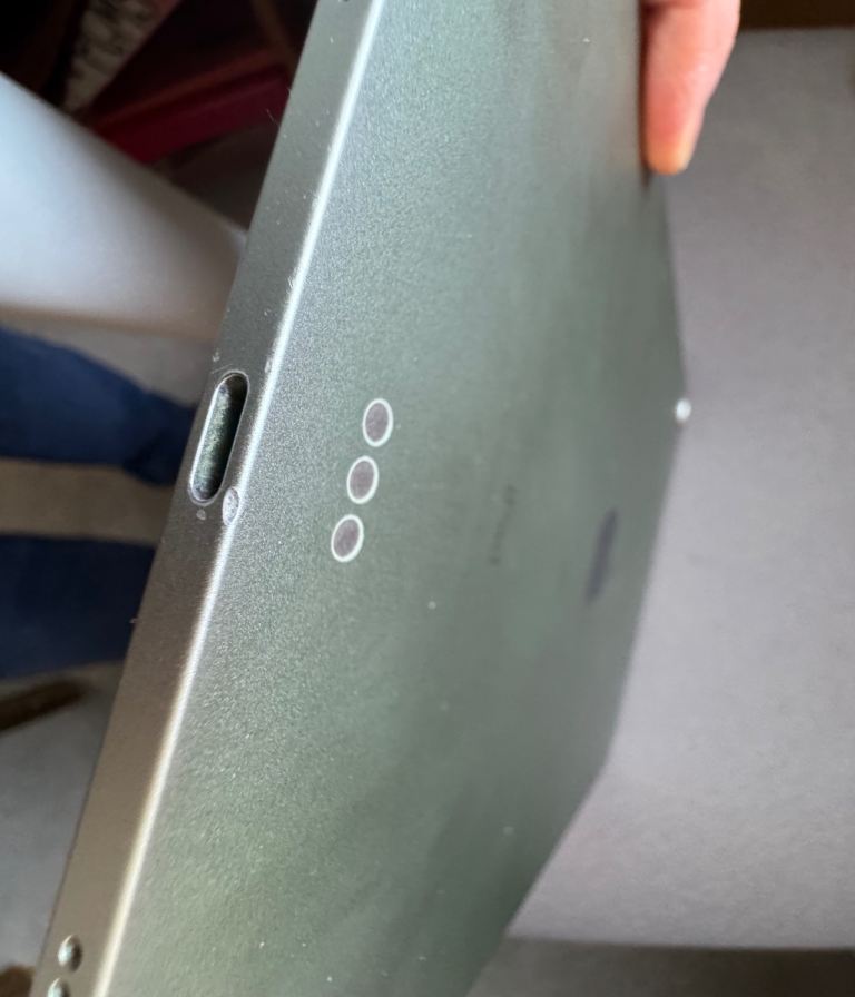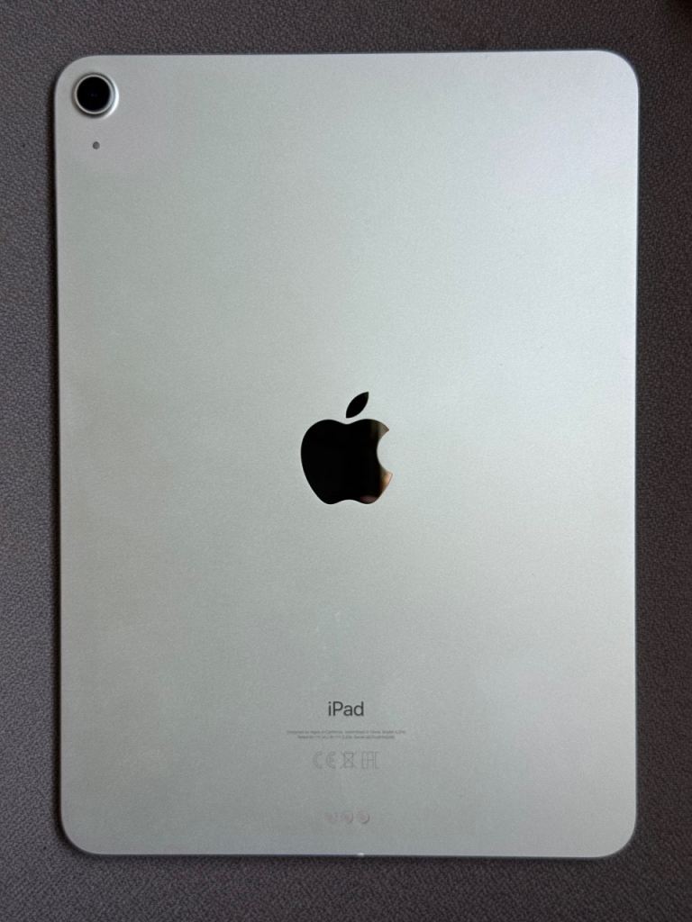 iPad Air 4th gen (Wi-Fi model) in Silver aluminium, 64GB. Screen and body are in perfect condition and it works flawlessly. There is only a small, barely noticeable cosmetic mark on the side near the USB-C charging port. Battery is in excellent condition as it was hardly used.