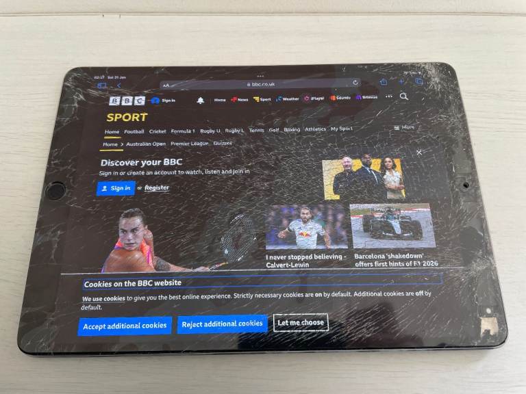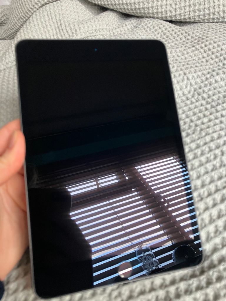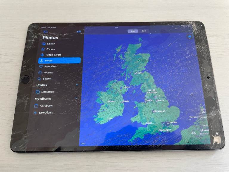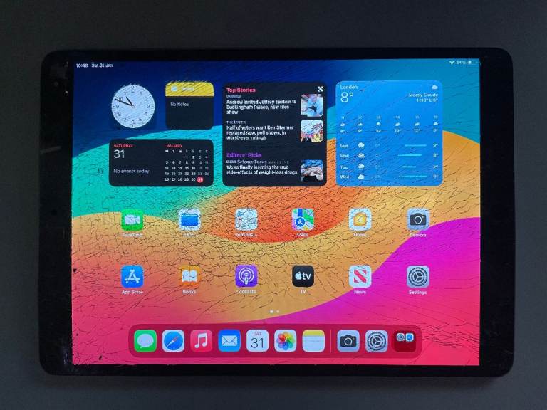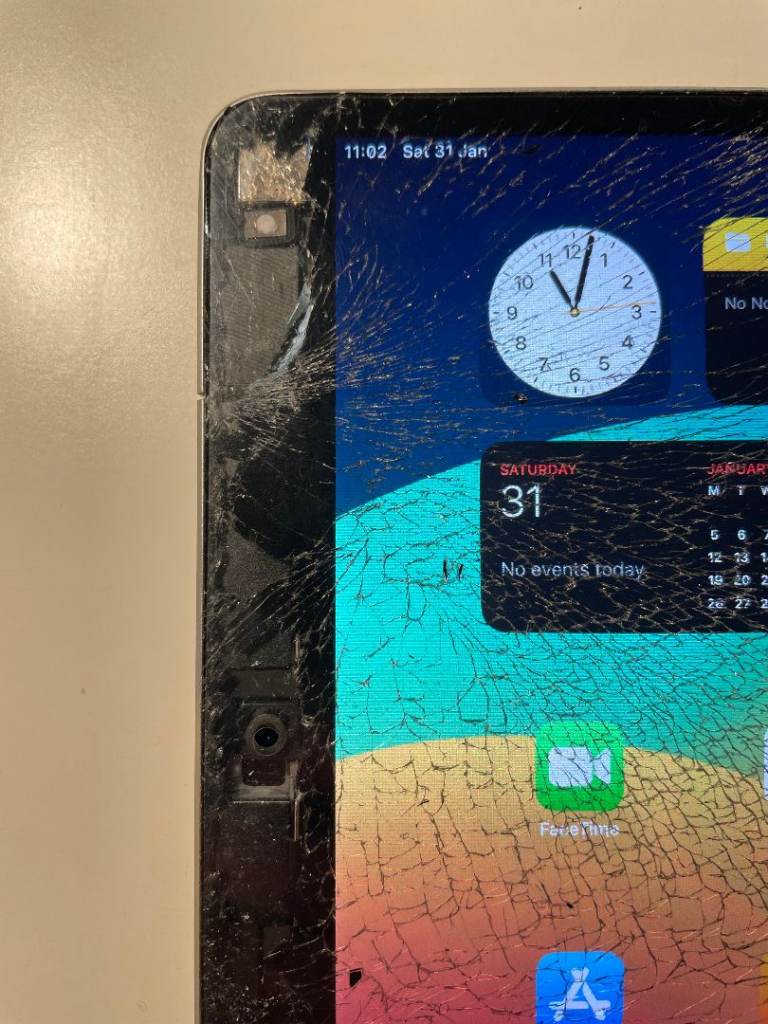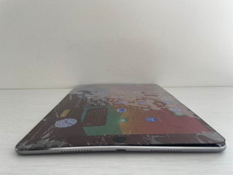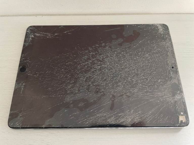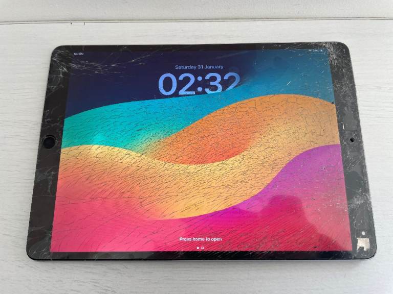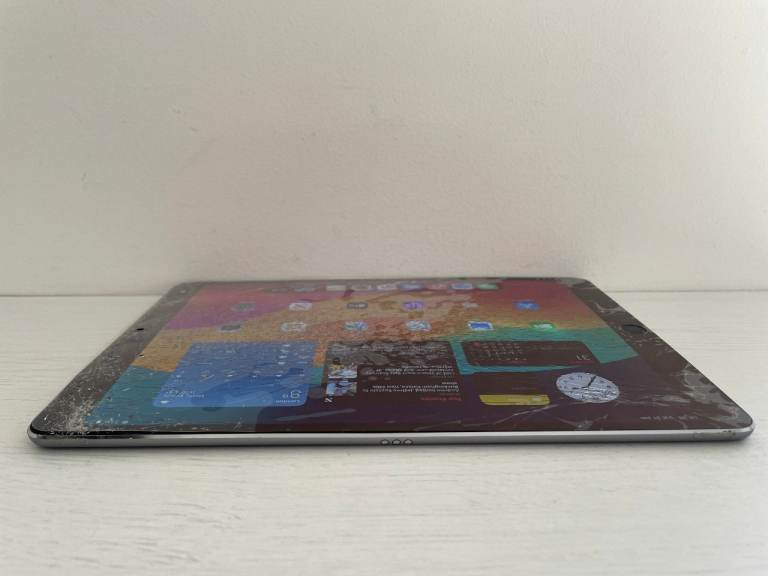 The iPad is powered on and functioning, however it has noticeable cosmetic damage resulting from an accidental drop.