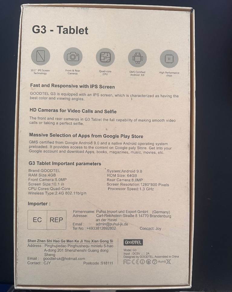 GOODTEL 10'' Tablet with a range of accessories (WiFi + Dual SIM compatible).