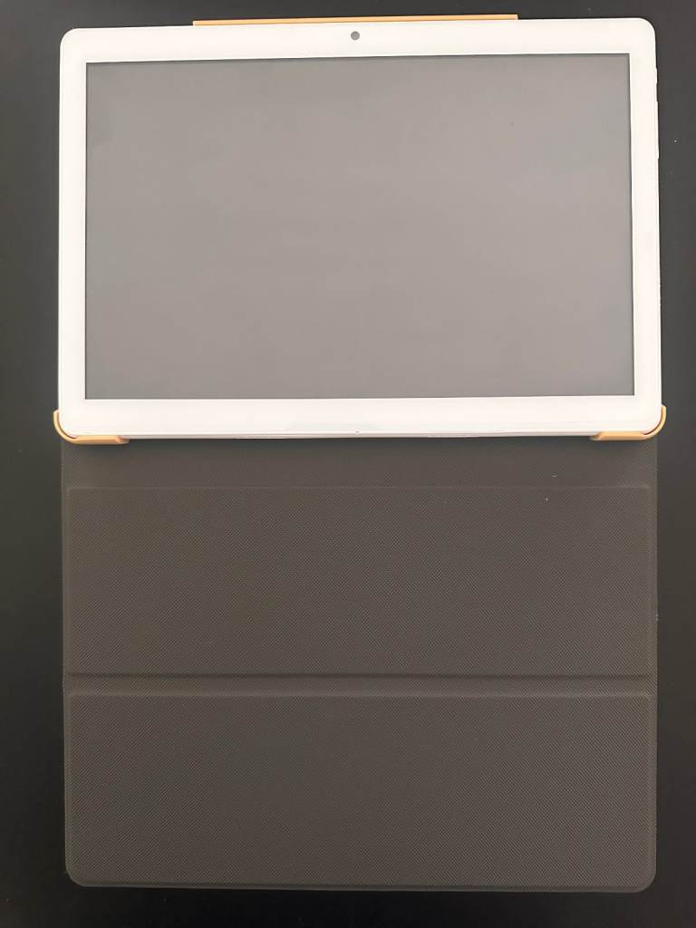 - Android 9 with Bluetooth Keyboard, mouse and Gold Tablet Case.