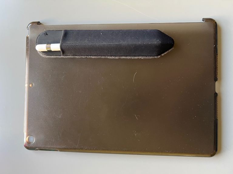 Silicon protective back cover with adhesive pencil holder.