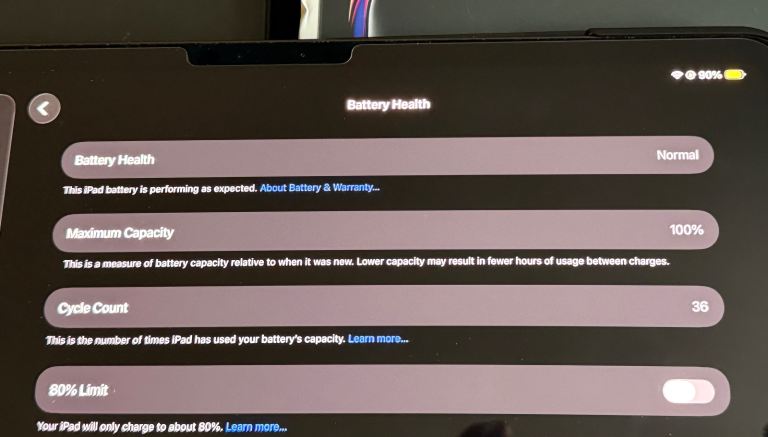 The iPad has some age related marks but nothing major. These are covered up with the tempered glass and Smart Case. In my opinion, the device is in great working condition and functions perfectly. Battery health is also at 100% with a very low cycle count.