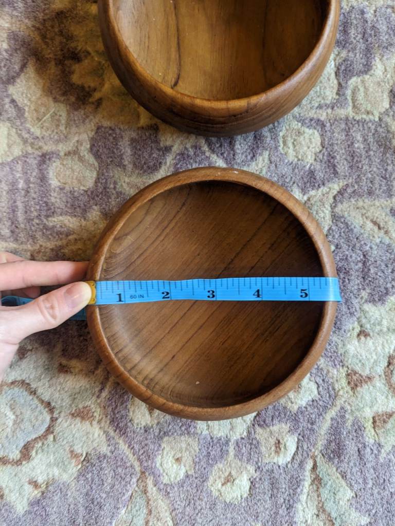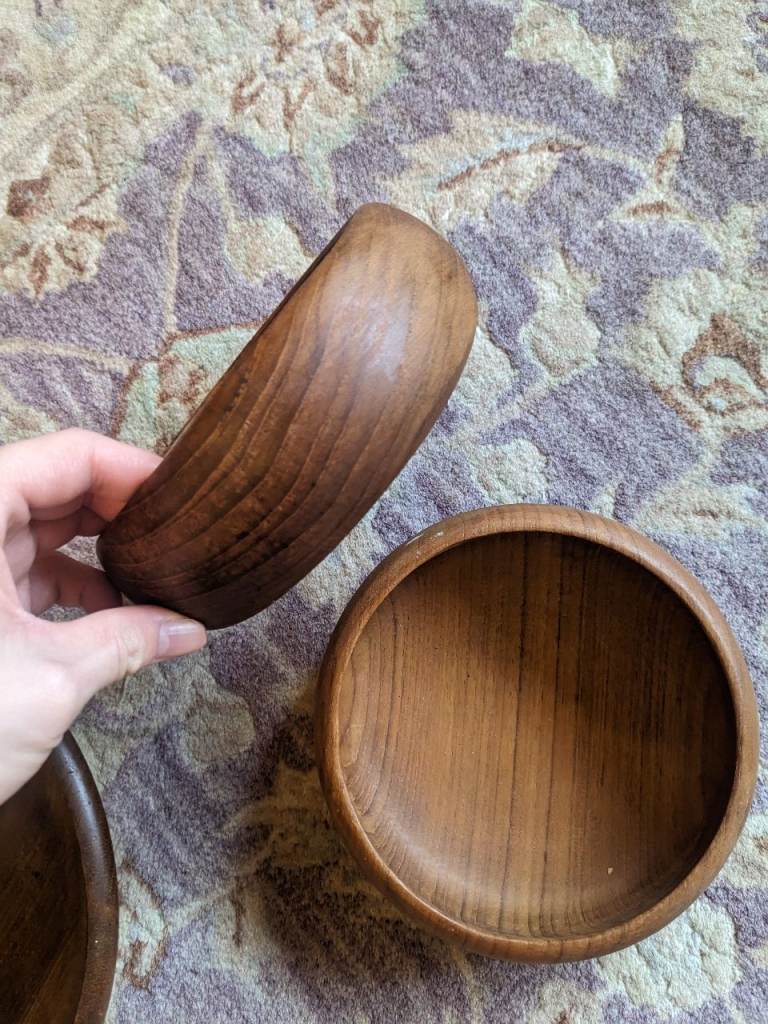 2 vintage small teak bowls, 5 inches in diameter and 2 inches tall.