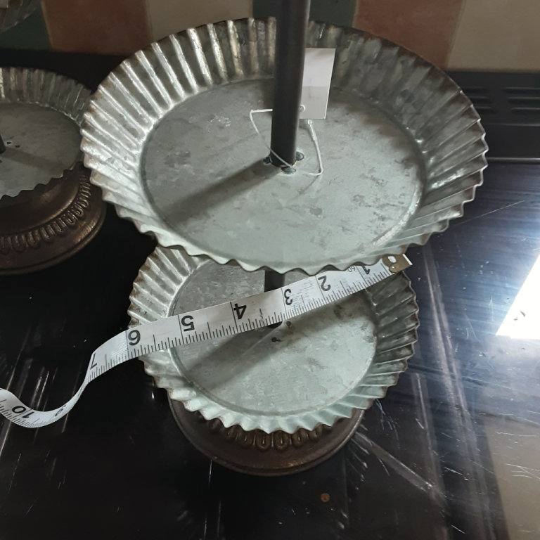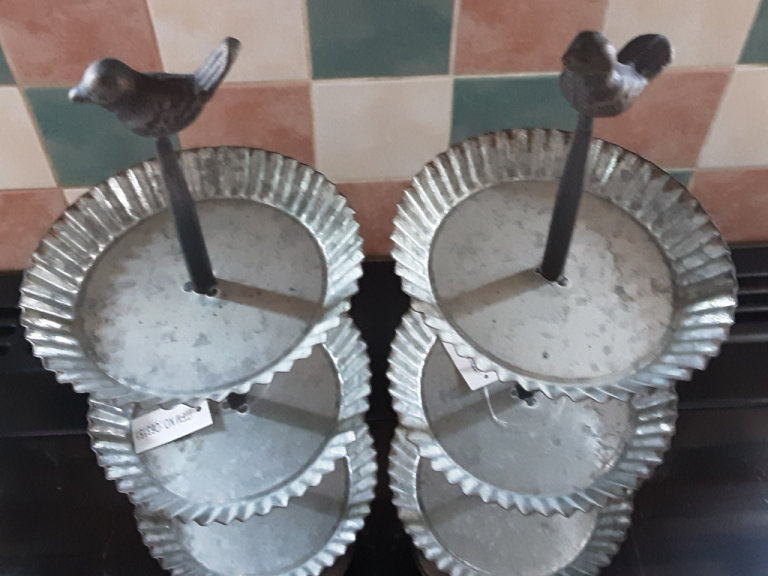 2 rustic 3 tired stands, with galvanised metal fluted dishes and bird finial,ideal for afternoon teas, barbecues, parties small fruit such as berries, as a snack or nibbles stand, or just a a decorative item.