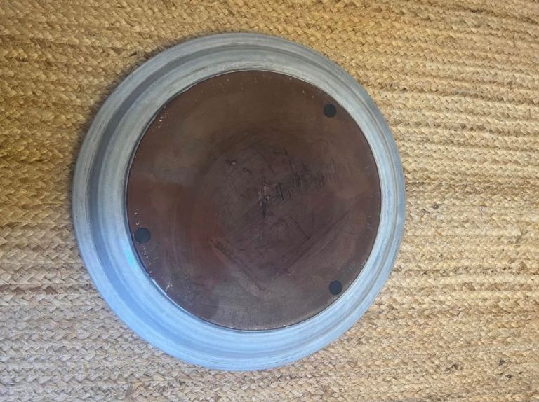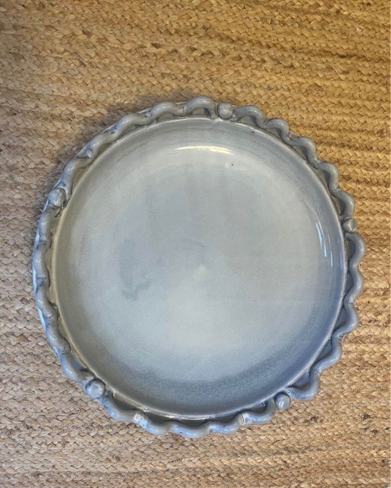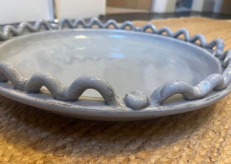 Beautiful and very heavy Abigail Ahern decorative bowl/dish. Light grey crackly glaze and detailing around the sides. Measures approx 42cm across.