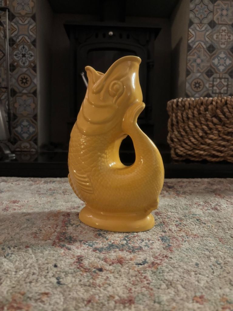 Wade gluggle jug , ideal for water , juices , or even flowers large yellow jug .