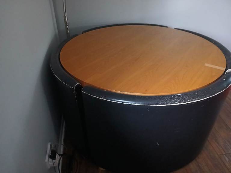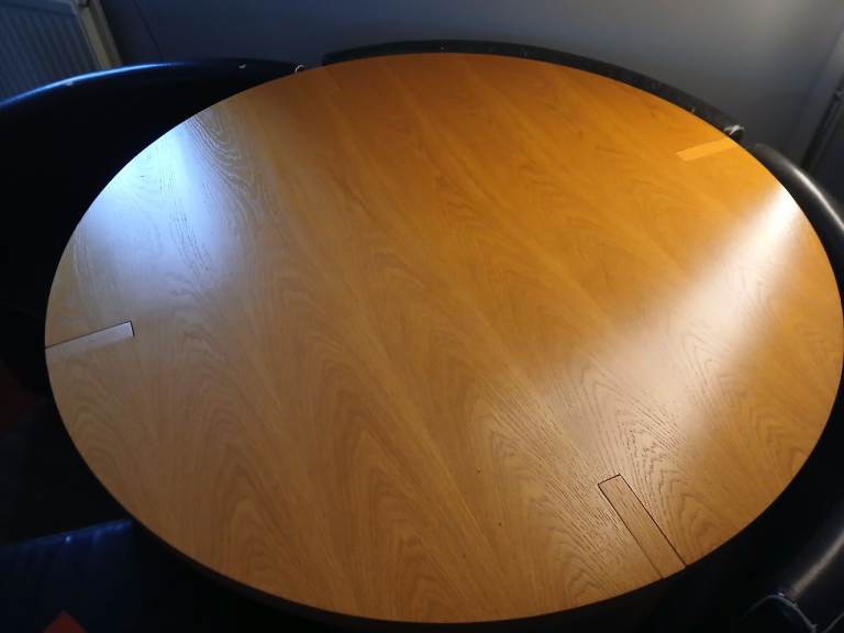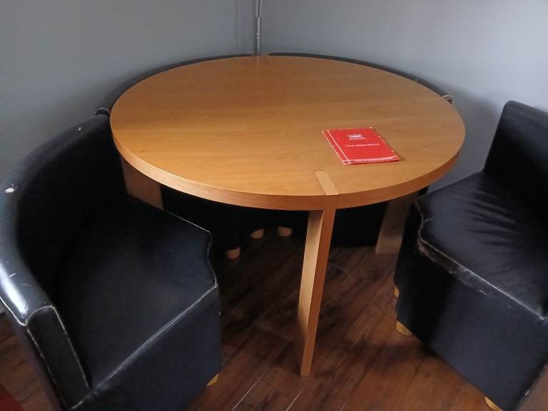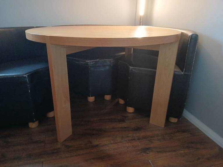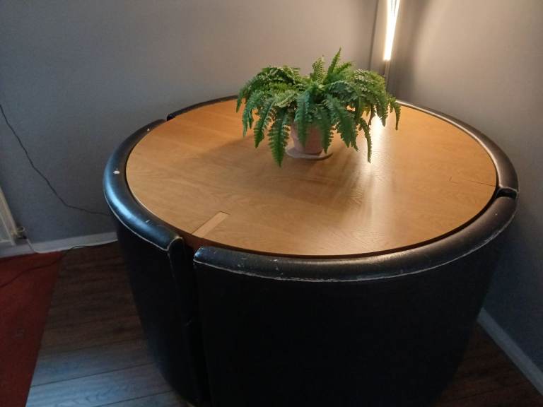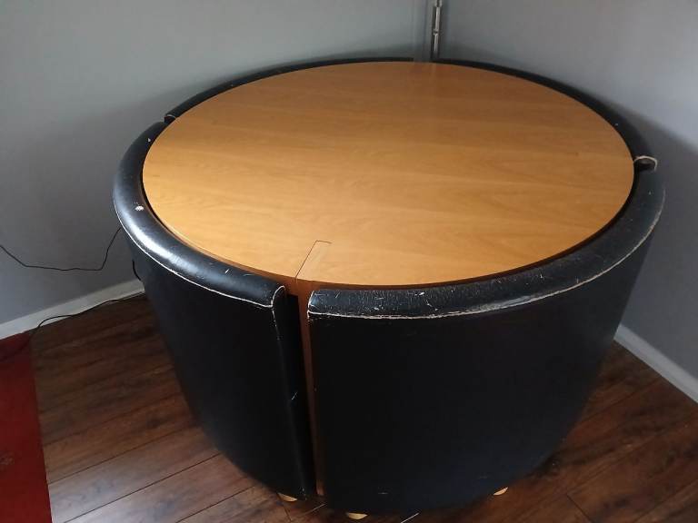 Solid wood table, no marks, scratches or chips, but the chairs being that they are Faux leather need a little attention. Table measures:- 120cm x 120cm x75cm high. This is a huge reduction on the price paid when new, and what I believe is a good bargain. The table is also fairly heavy, which adheres to its solid construction.