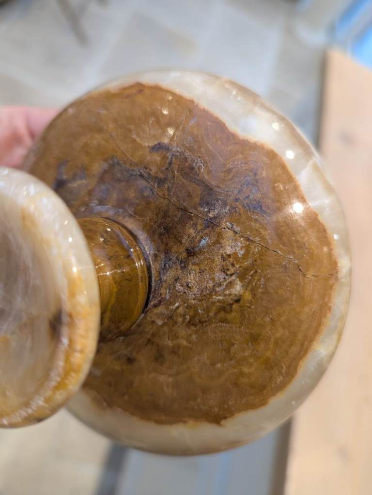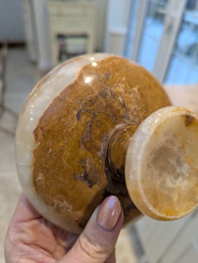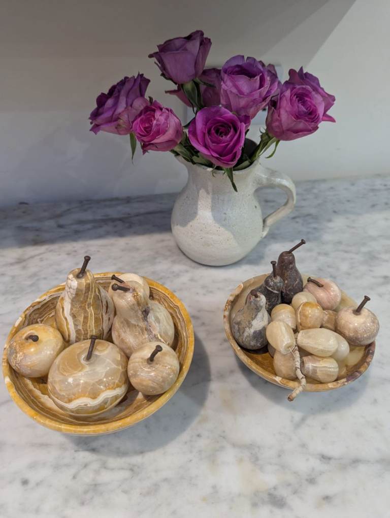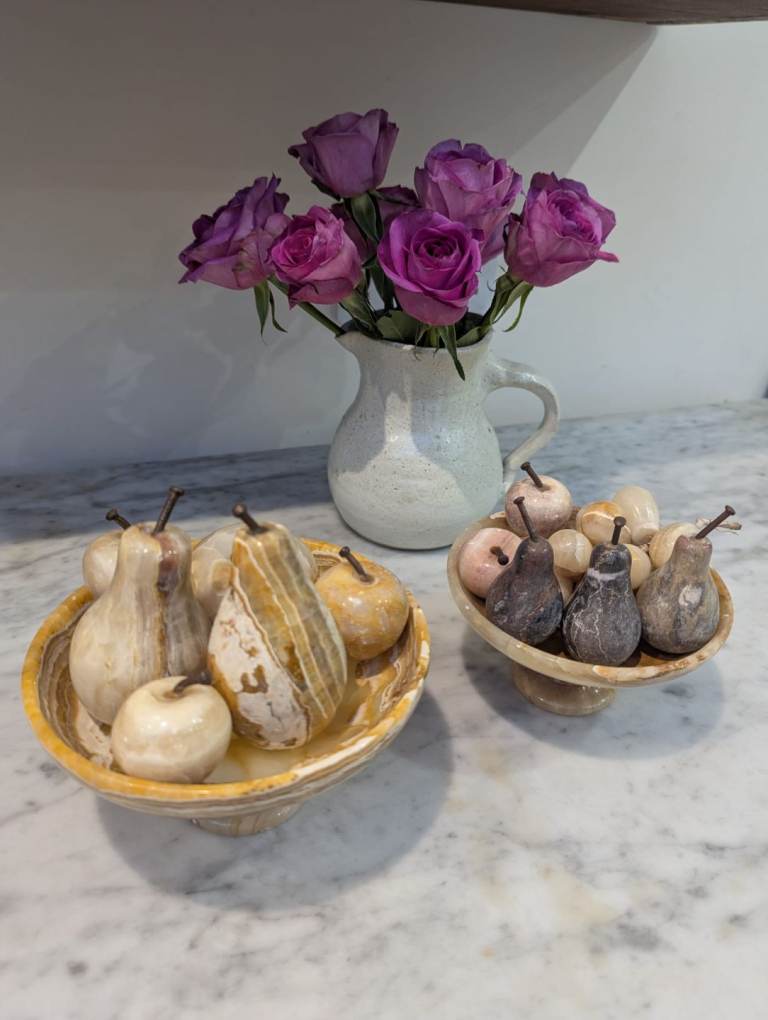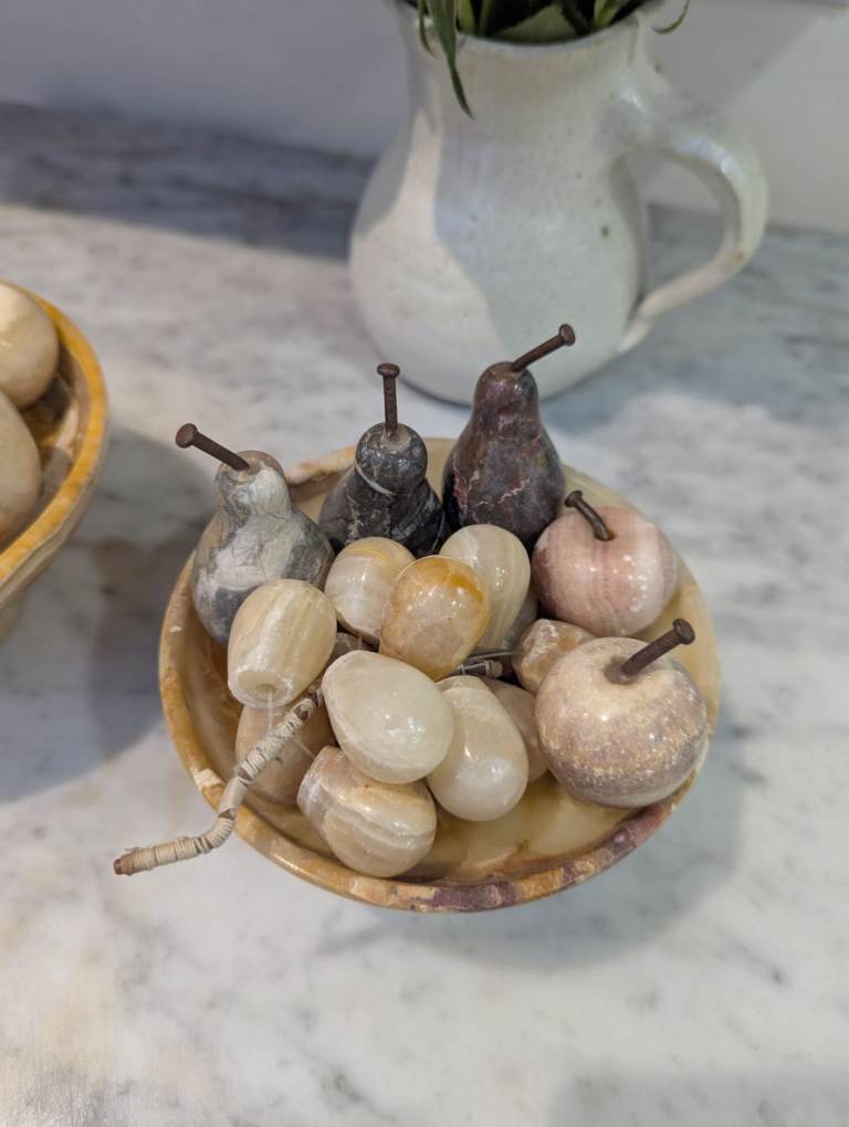Vintage marble or onyx decorative fruit bowl with apples and pairs.