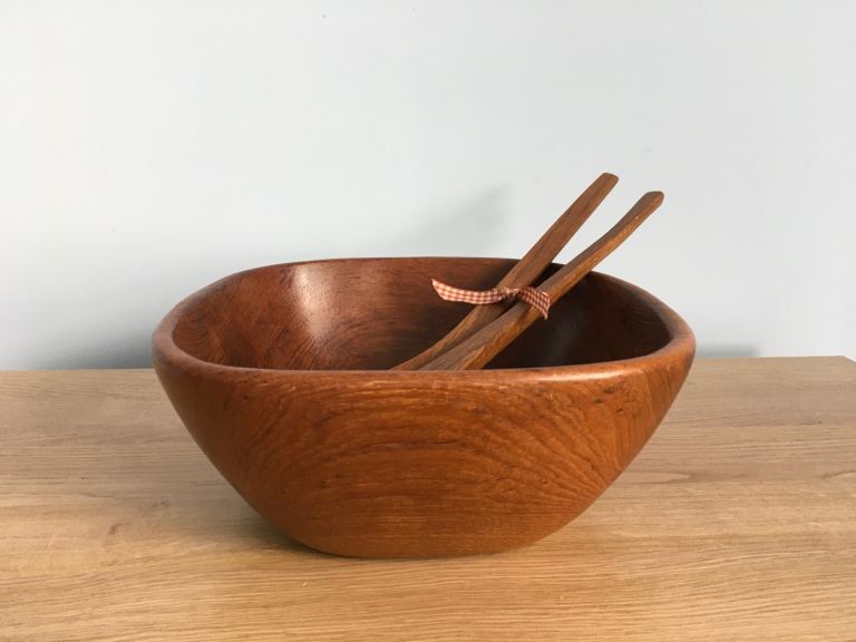 Vintage mid century teak salad serving bowl and servers.