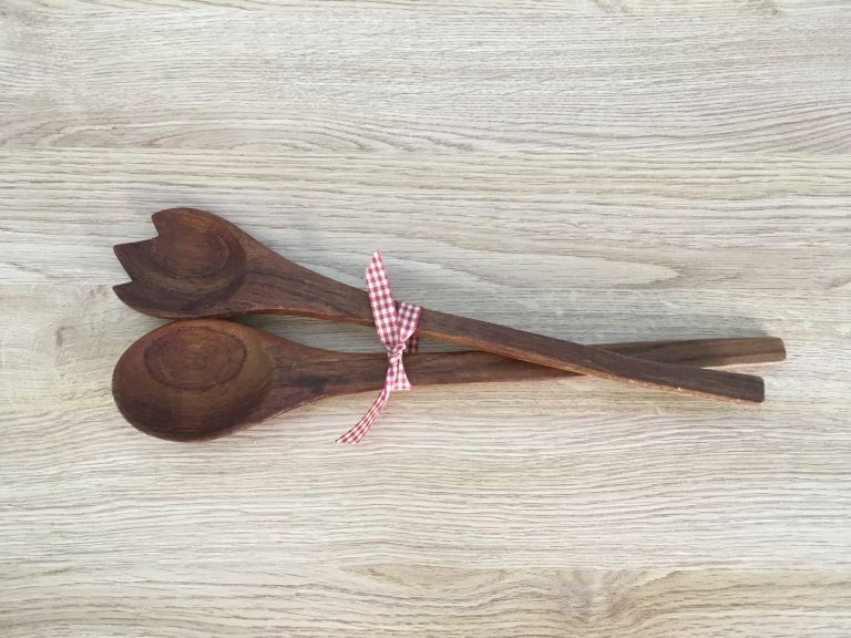 Vintage mid century teak salad serving bowl and servers