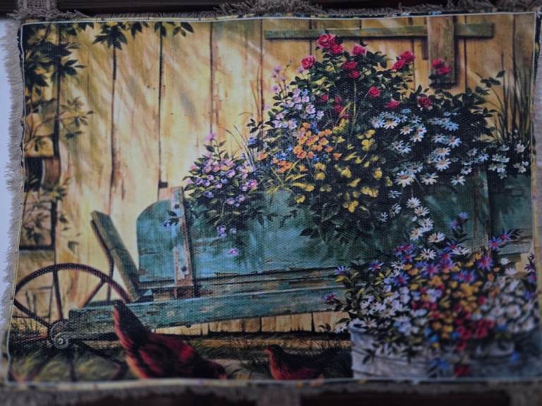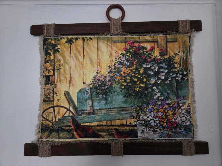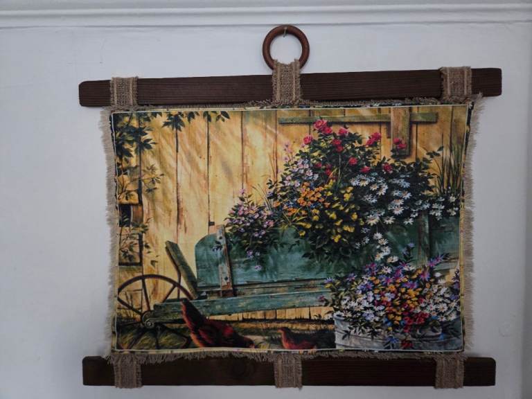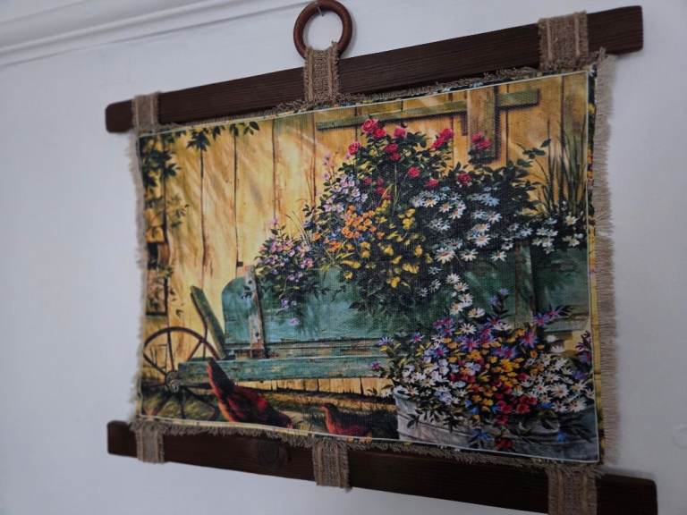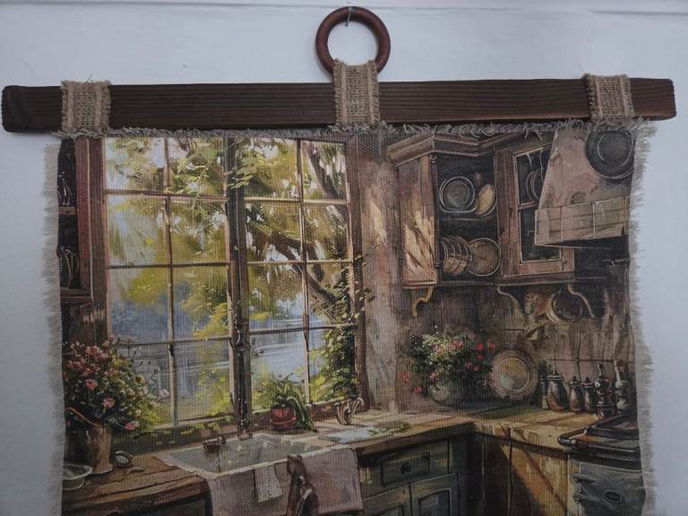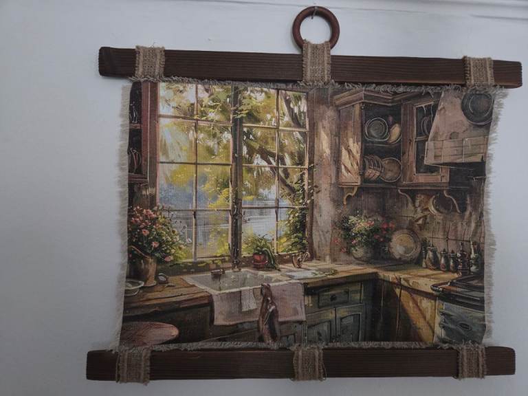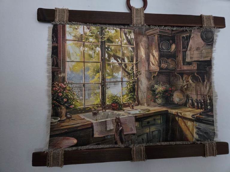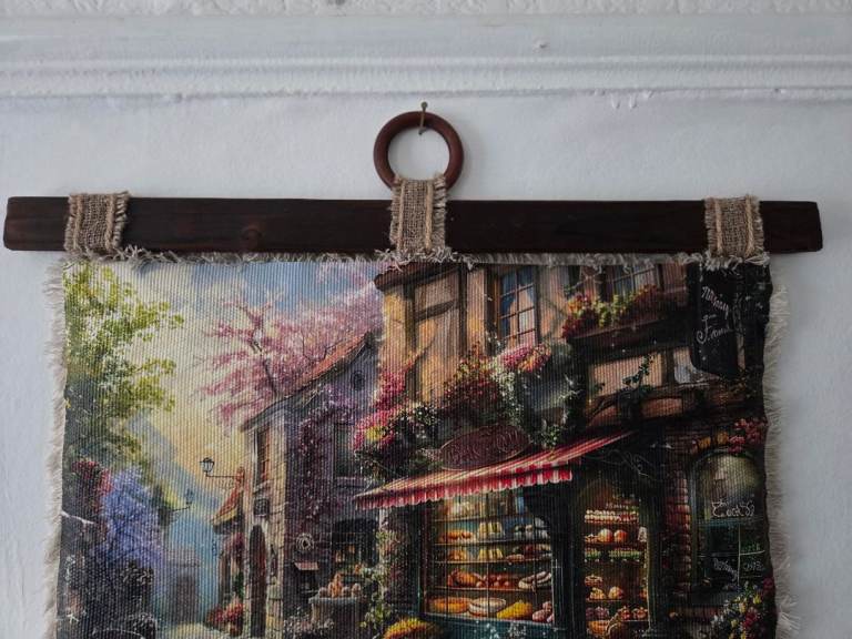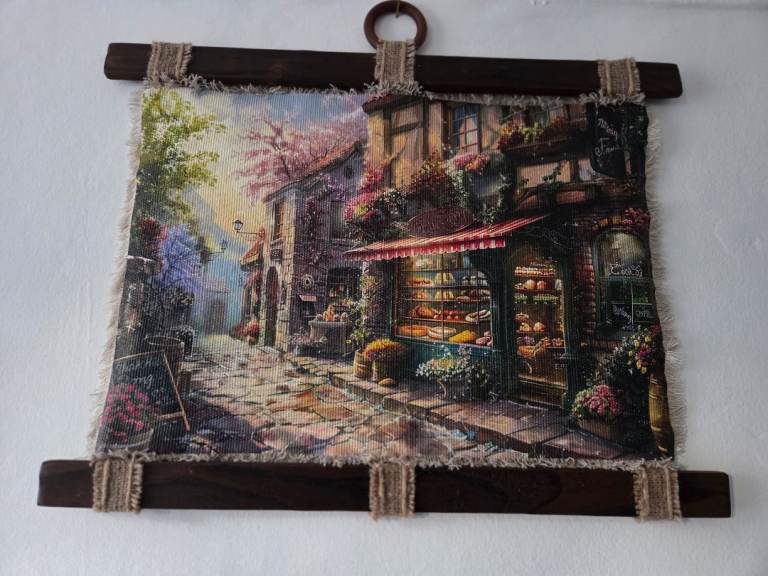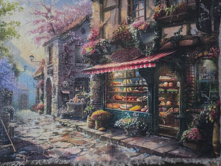 One picture depicts an old kitchen of the past,another shows an old country bench surrounded by flowers and the third one shows an old market street with the highlight focusing on a bakery