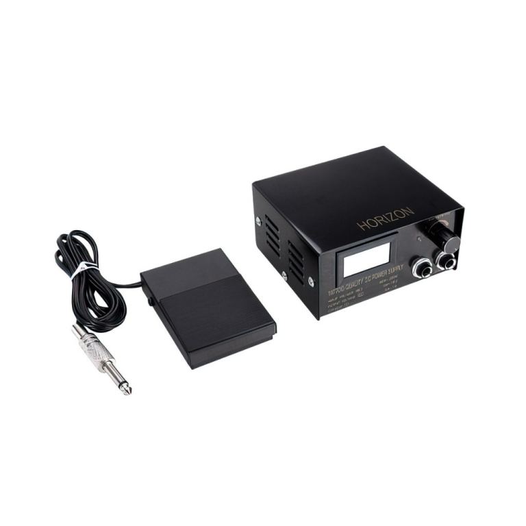 The kit comes complete with two great running machines, the Snake Charmer and Gold Skull tattoo machines, which can be set for both lining and shading. The tattoo machines are hand tuned in our workshop before despatch, which can be hooked straight up to the ultra-steady high quality Horizon digital power supply.