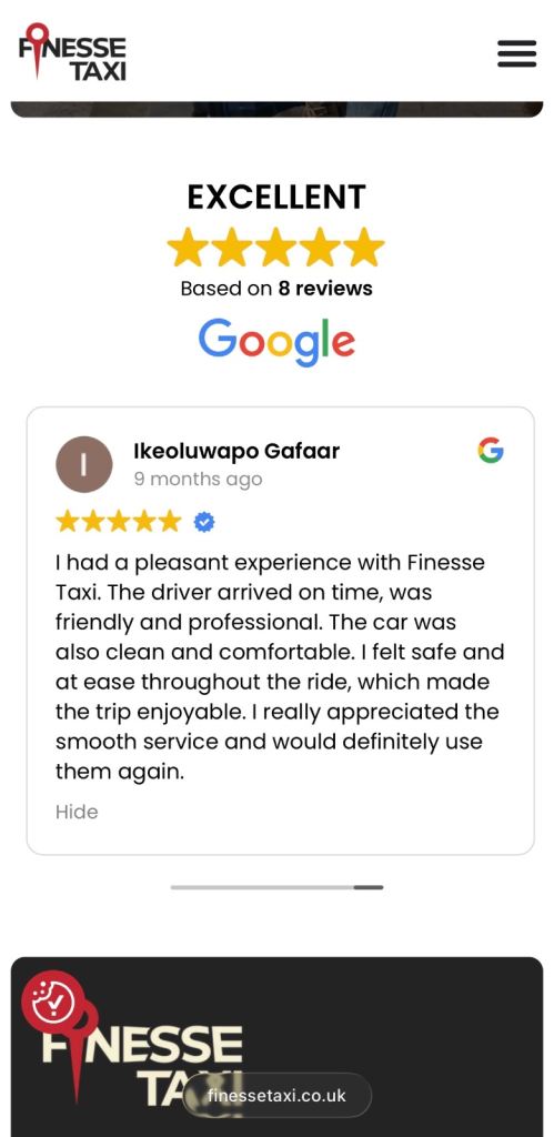 With a full range of reliable taxi services tailored to meet local travel needs, Finesse Taxi offers everything from quick city centre pickups in Maidstone to long-distance journeys and airport transfers across Kent and the South East.