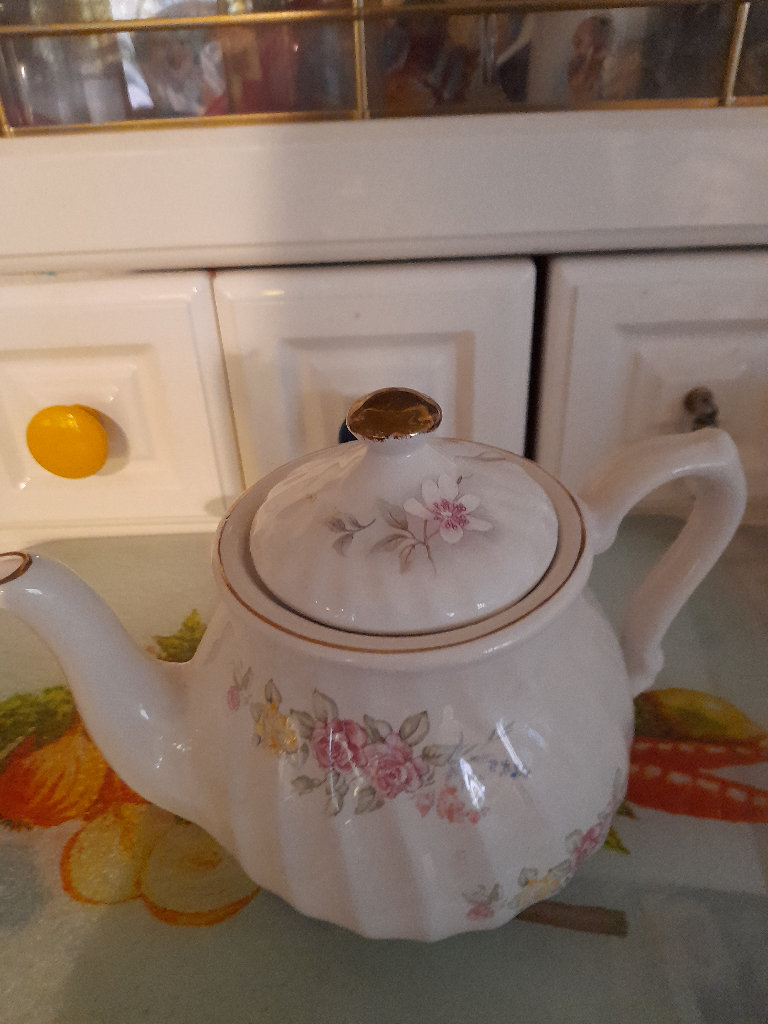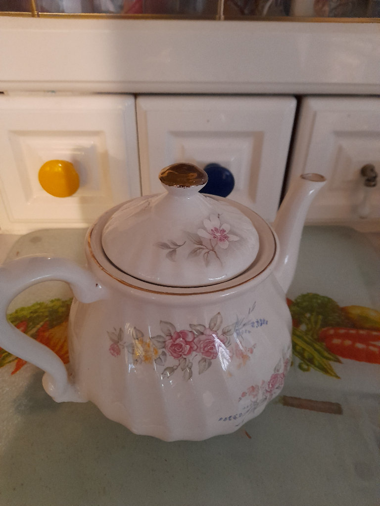 A Posh large Decorative Flower Teapot edged with a gold rim round the edge and lid knob.
