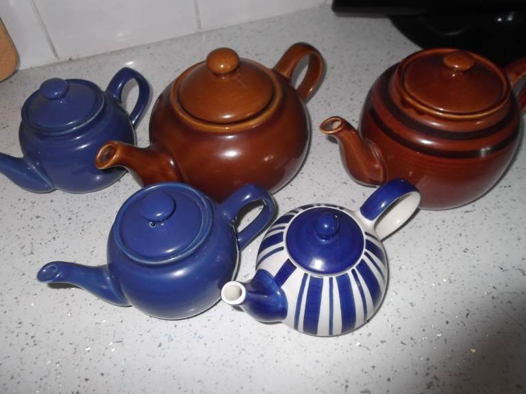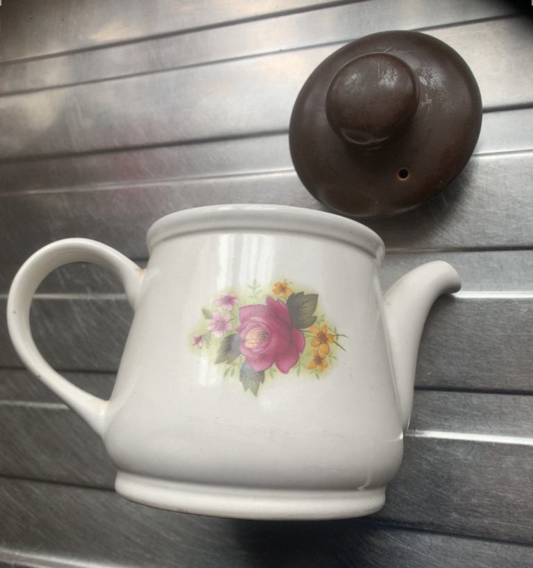 Brand new teapot still in the box. It is porcelain and patterned. The teapot is made in china and it is from Costco. No tea bags I am afraid to say.