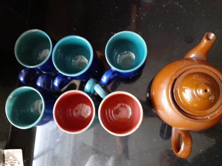 A nice ceramic breakfast tea set comprising 6 mugs & a teapot in good clean condition.