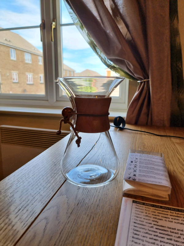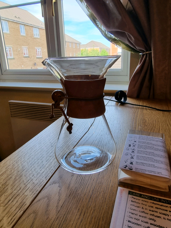 Handmade glass coffee infuser with wooden cuff, leather thong & wooden bead fastening.