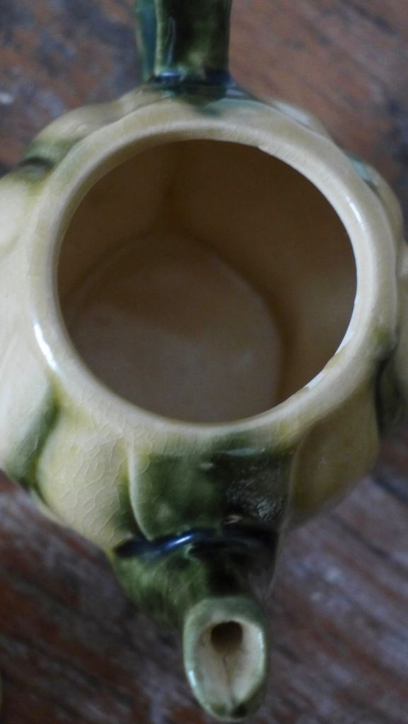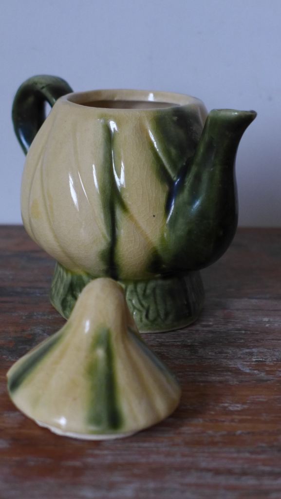 COLLECTABLE: SMALL VINTAGE NOVELTY POTTERY TEAPOT. VINTAGE LEAF TEAPOT.