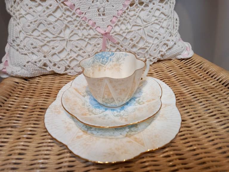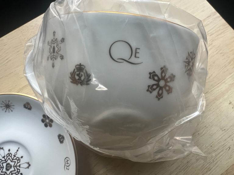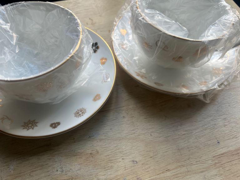 This pair of Halcyon Days cups and saucers are boxed, still in wrapping and tissue never been used, need room in the cupboard