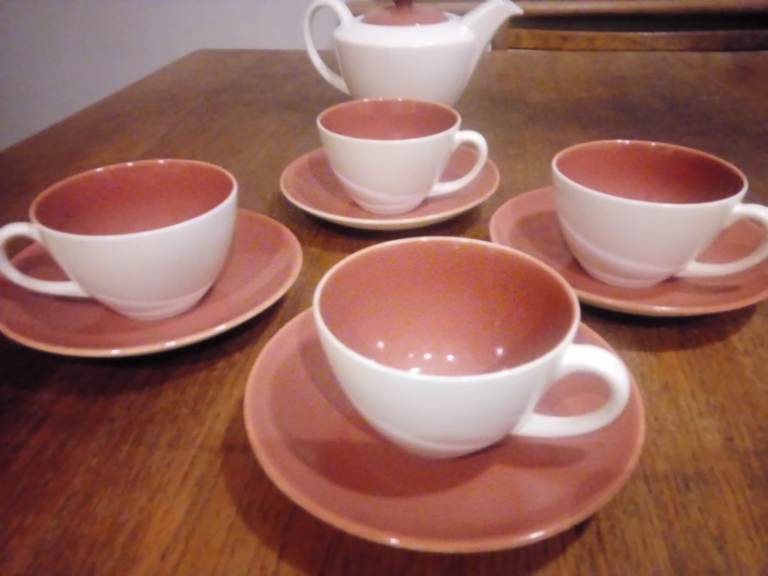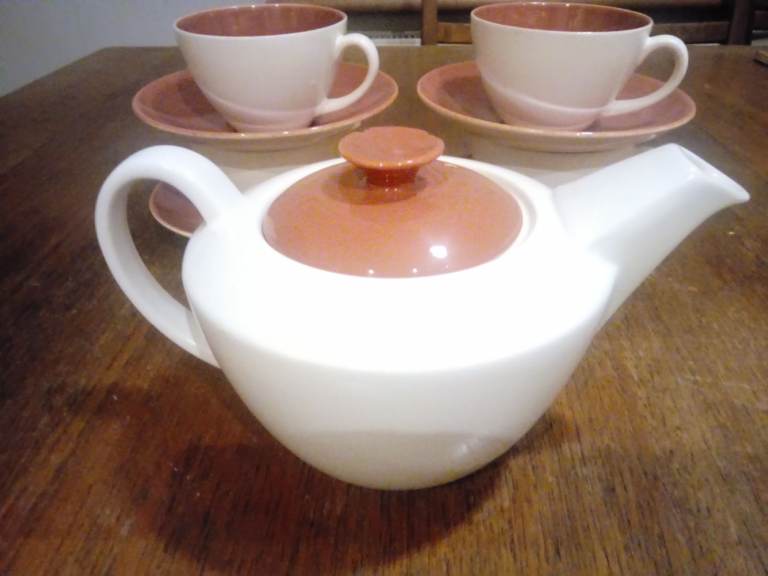 Poole Pottery tea set in the Twin Tone colourway Red & Magnolia (C95).
