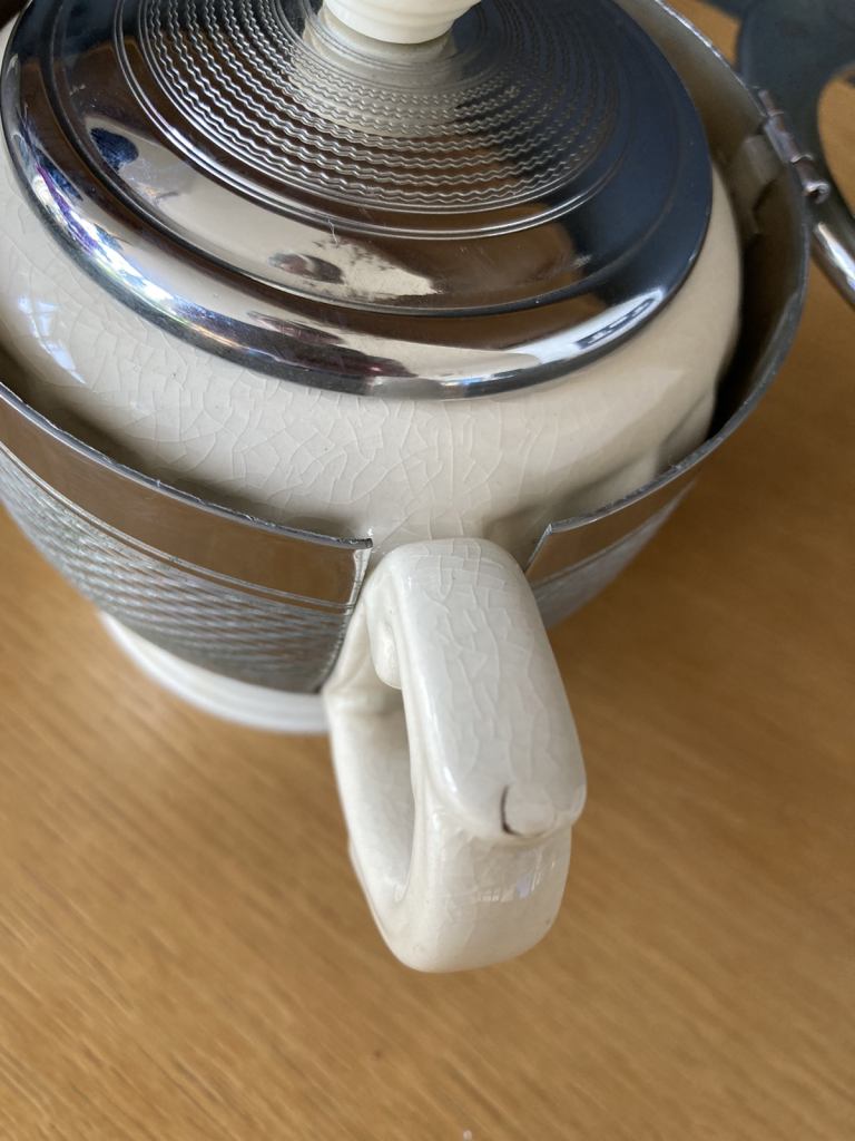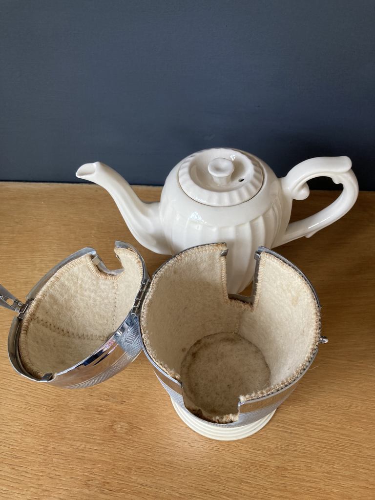 Teapot has off-white/ cream ceramic body and lid. It sits in chrome case with beige heat retaining material within it.