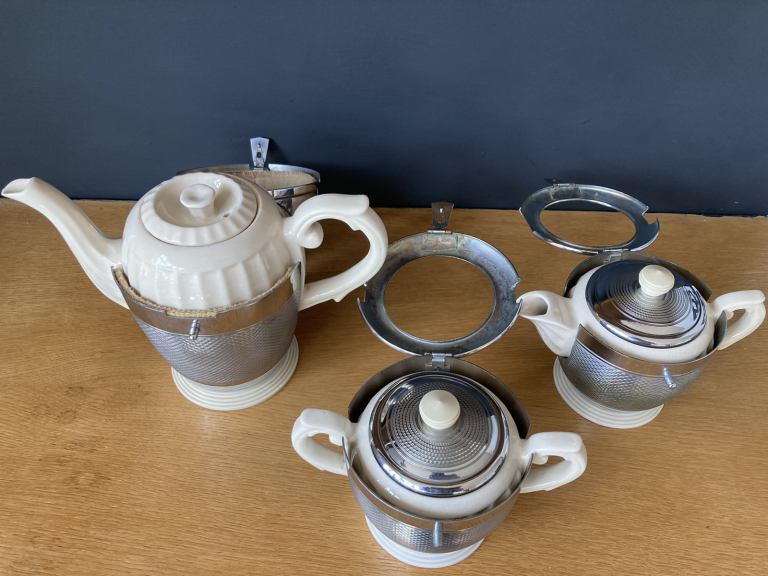 Vintage Heatmaster ceramic and chrome teapot, milk jug and sugar bowl set. Made in England. A stylish set.