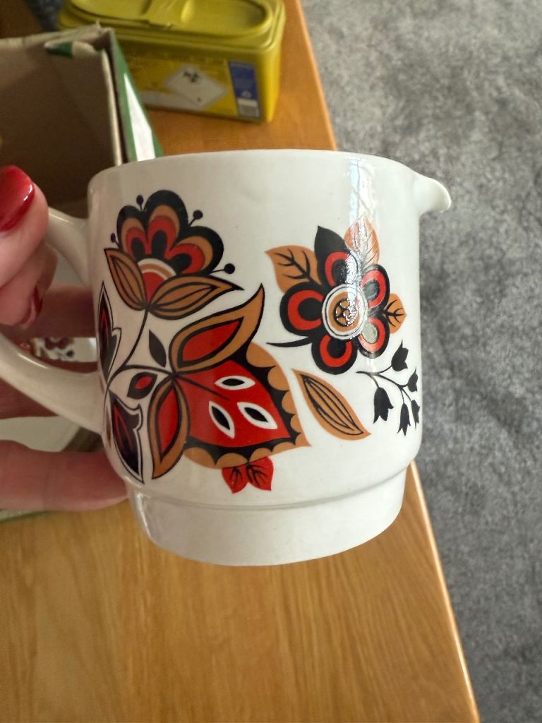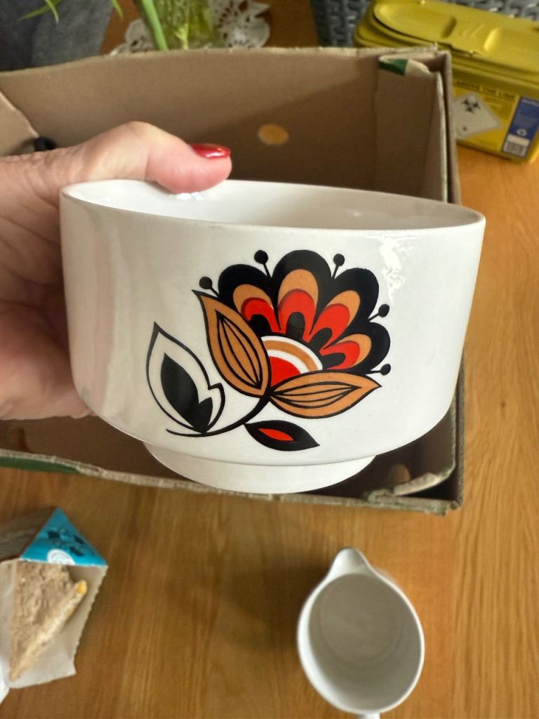 Retro coffee set. 6 cups, saucers, plates 1 cake plate. Sugar bowl and milk jug.