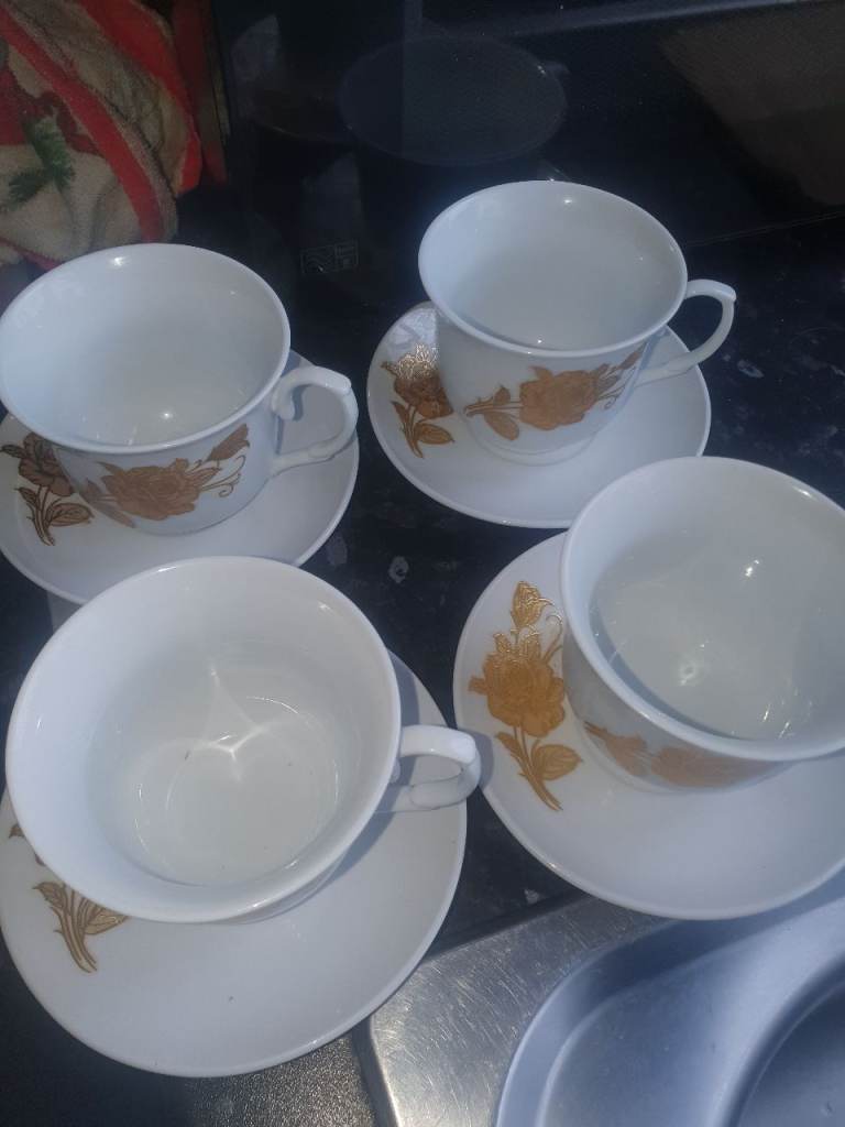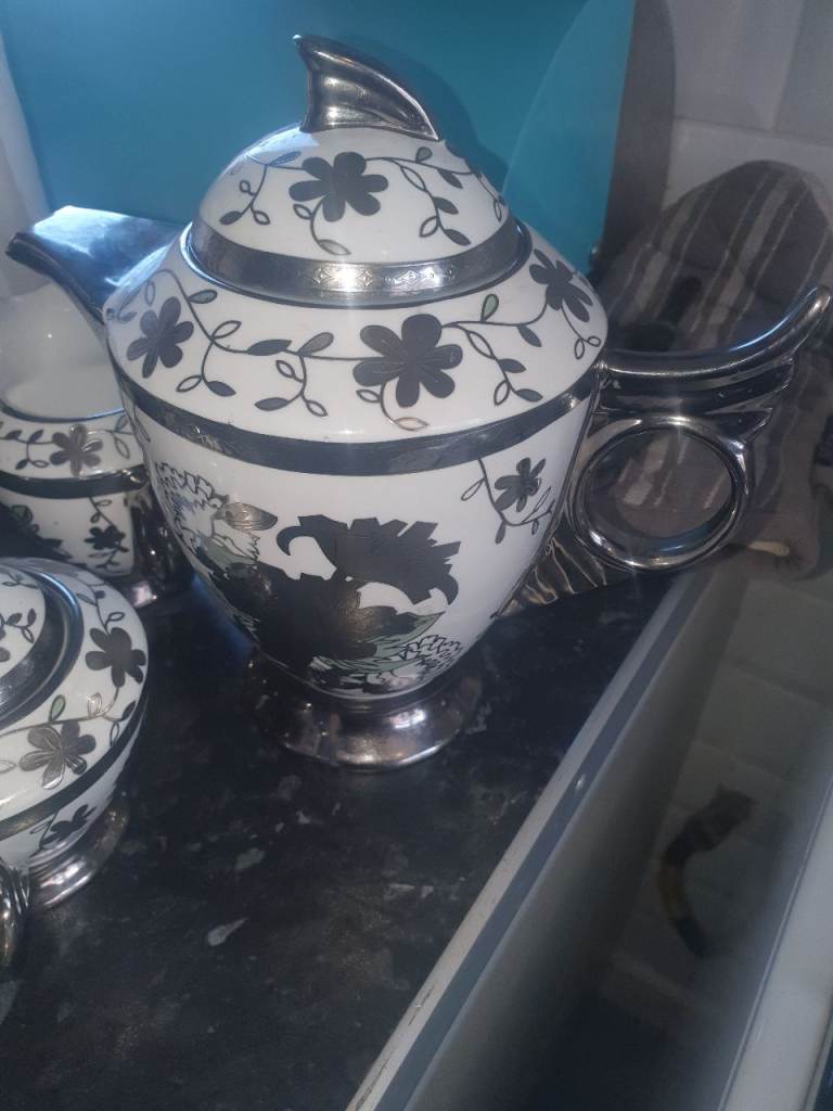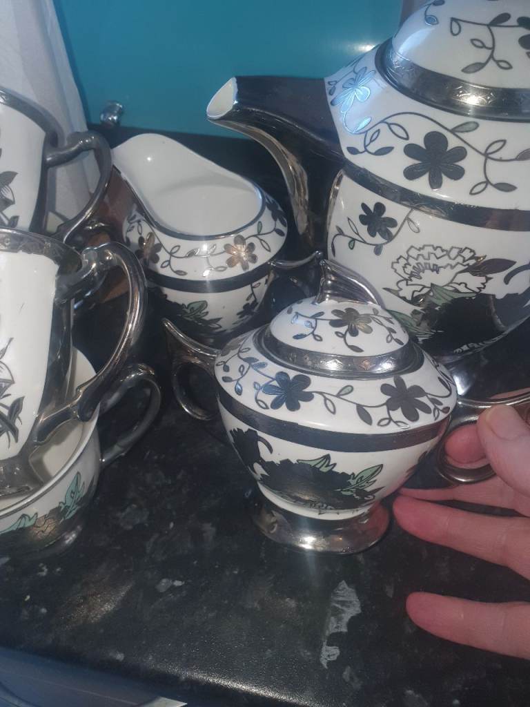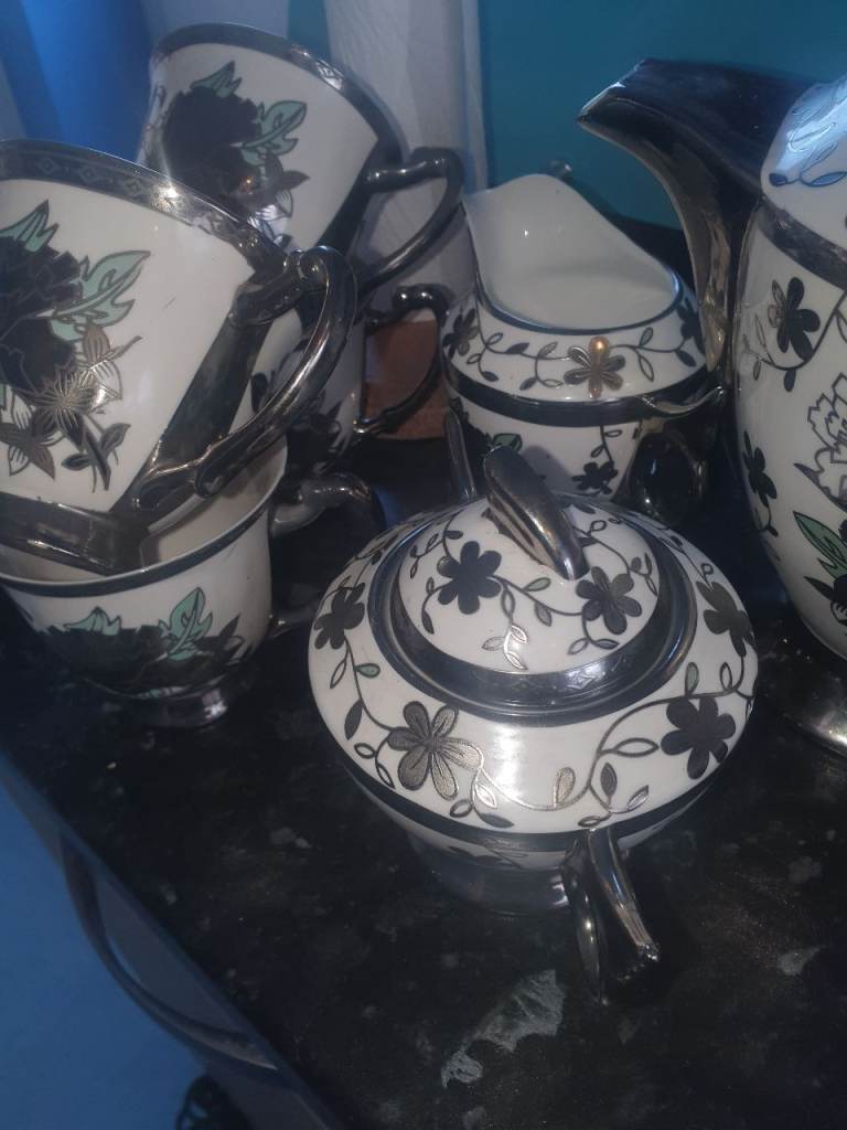 Silver Ceramic Coffee Set & 4 Gold Leaf Cups/Saucers , Good Condition, Very Attractive & Useful. Expensive when brand new, Quality, Great Decor . Collection from Russell's Hall, bargain £10 the lot.