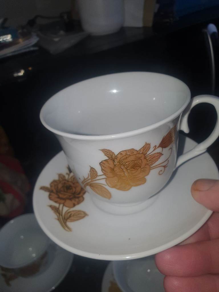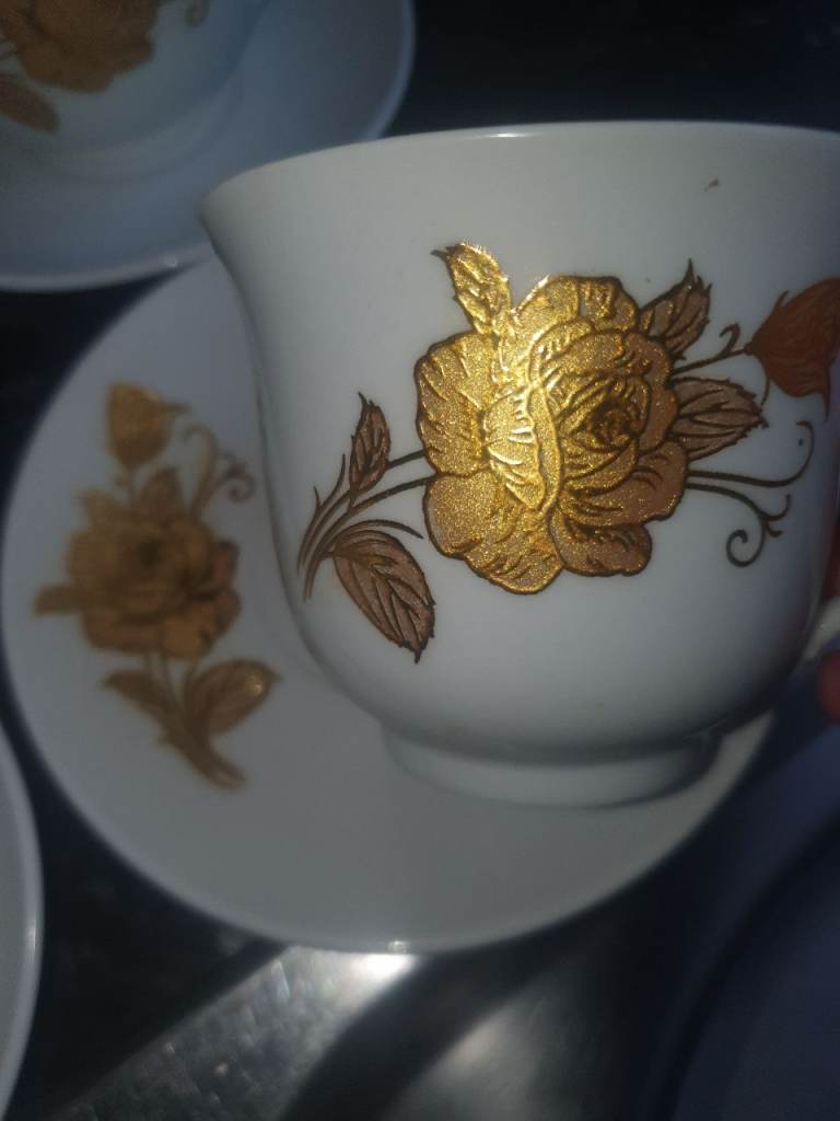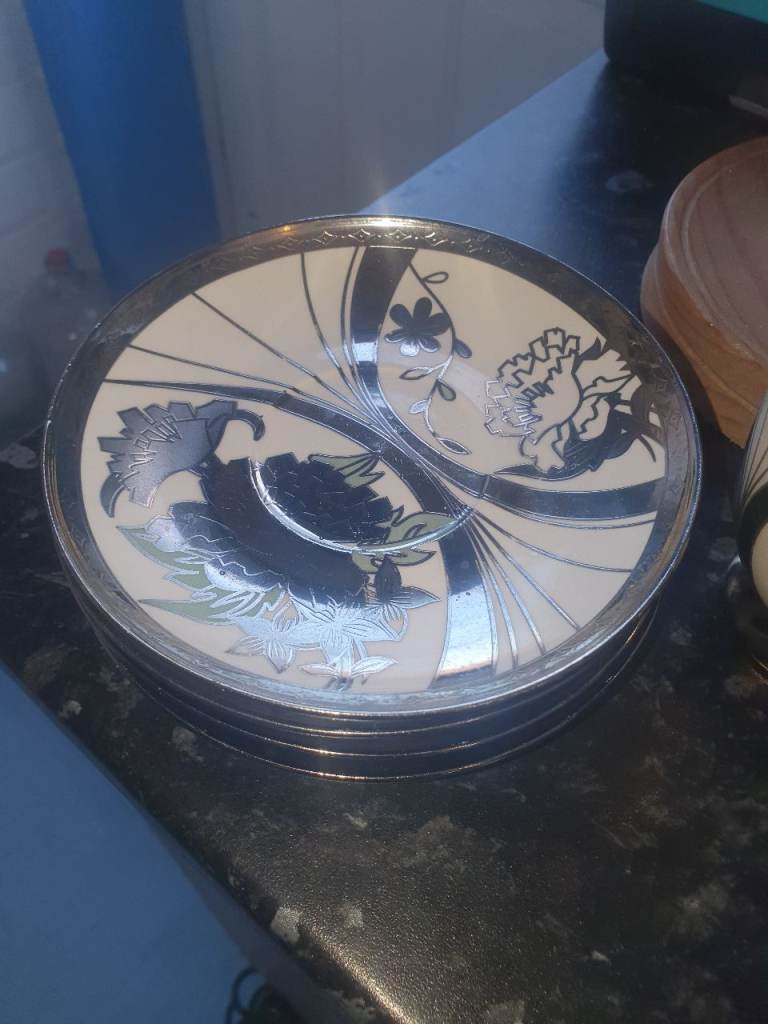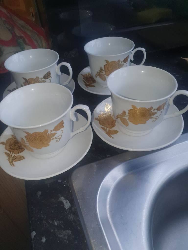 Silver Ceramic Coffee Set & 4 Gold Leaf Cups/Saucers , Good Condition, Very Attractive & Useful. Expensive when brand new, Quality, Great Decor . Collection from Russell's Hall, bargain £10 the lot.