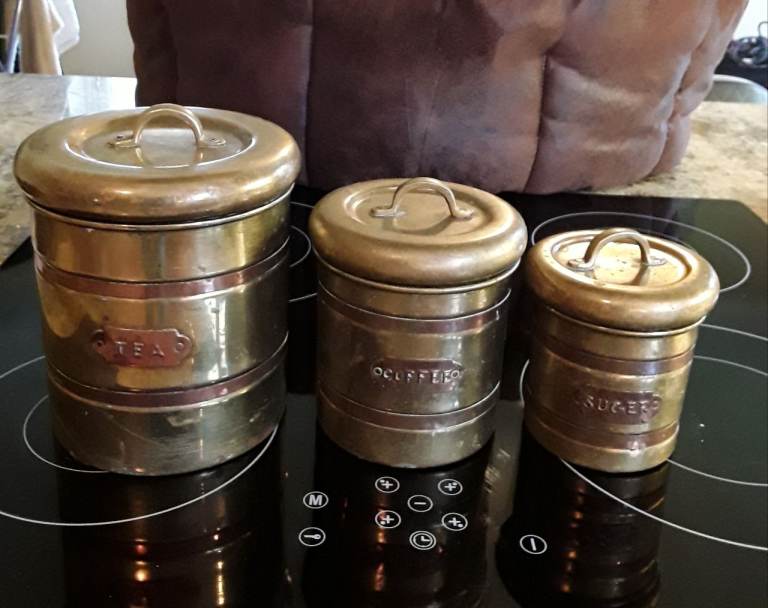 Brass and copper tea coffee sugar containers.