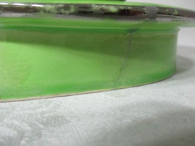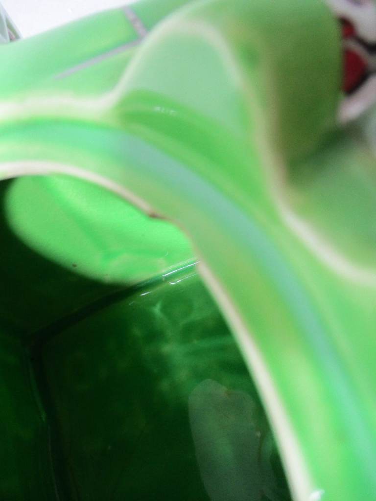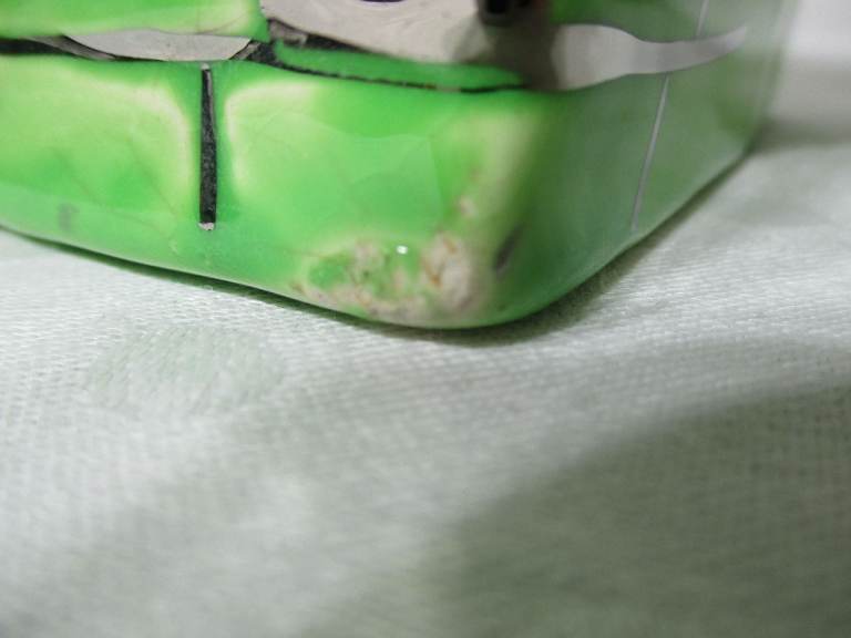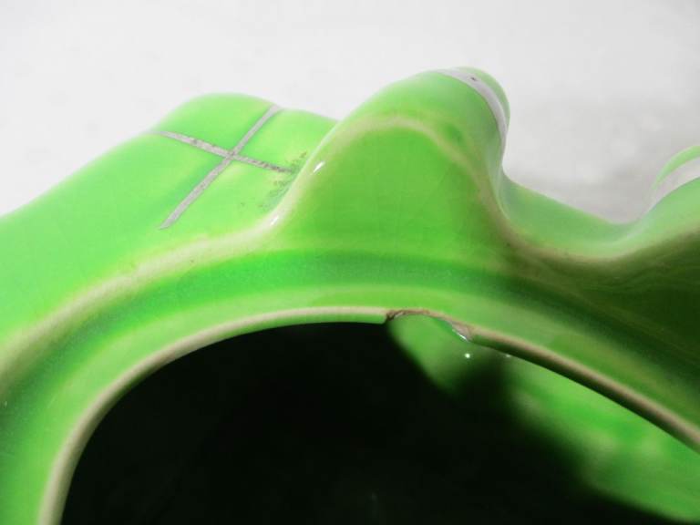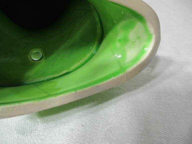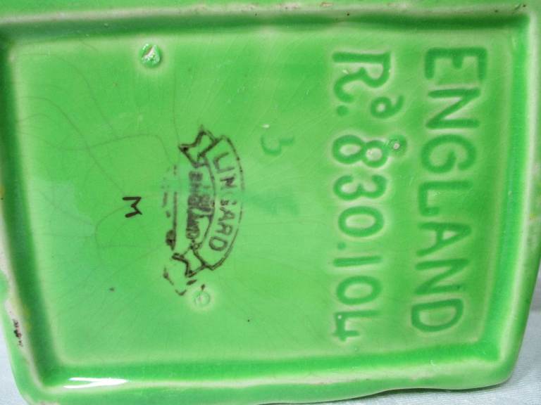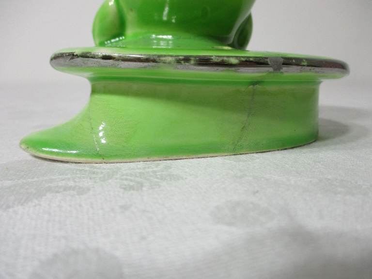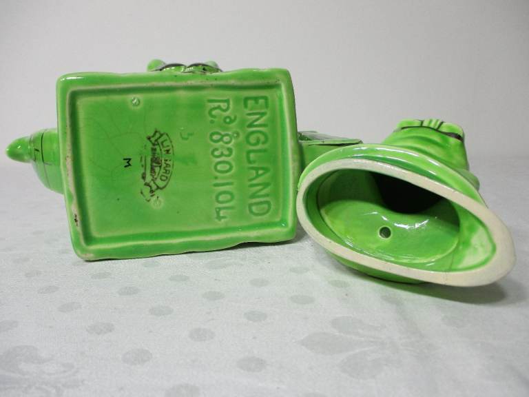 This vintage Lingard green/silver Humpty Dumpty novelty teapot from the 1930s is a charming collectable piece for teapot enthusiasts. Made from ceramic, this teapot features a unique Humpty Dumpty character design, adding a touch of whimsy to your kitchen decor. The green finish and novelty style make it a standout piece for collectors of vintage teapots. With its original British manufacture and original design, this teapot is a delightful addition to any teapot lover's collection. W22.5cm x D11cm x H18cm approx. There are a few minor condition issues - the underside of the lid has 2 cracks (not visible when the lid is on the pot). The inner rim of the pot has a chip - again, not visible when the lid is in place. There is a small area at the bottom back corner where some of the green glaze is absent - possibly a manufacturing defect. All defects clearly photographed. Otherwise, good vintage condition with hardly any wear to the silver gilding.